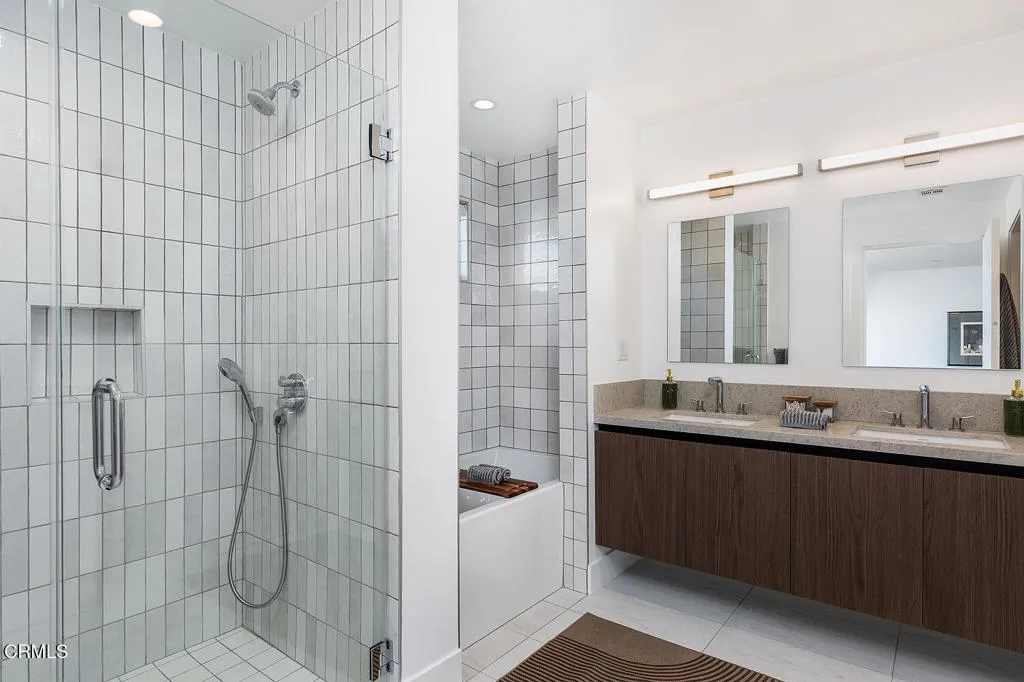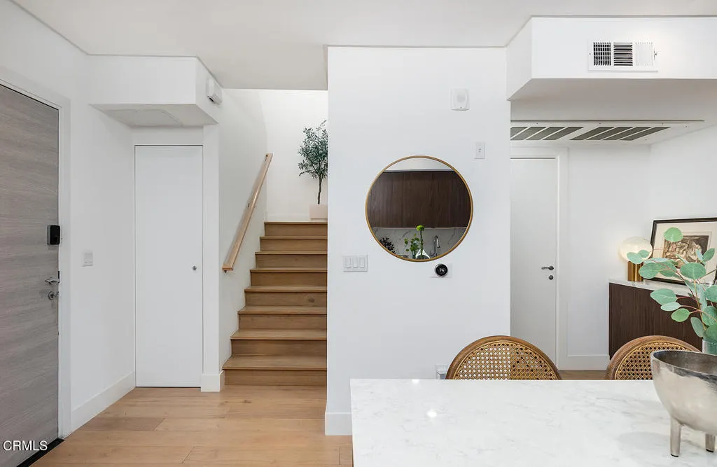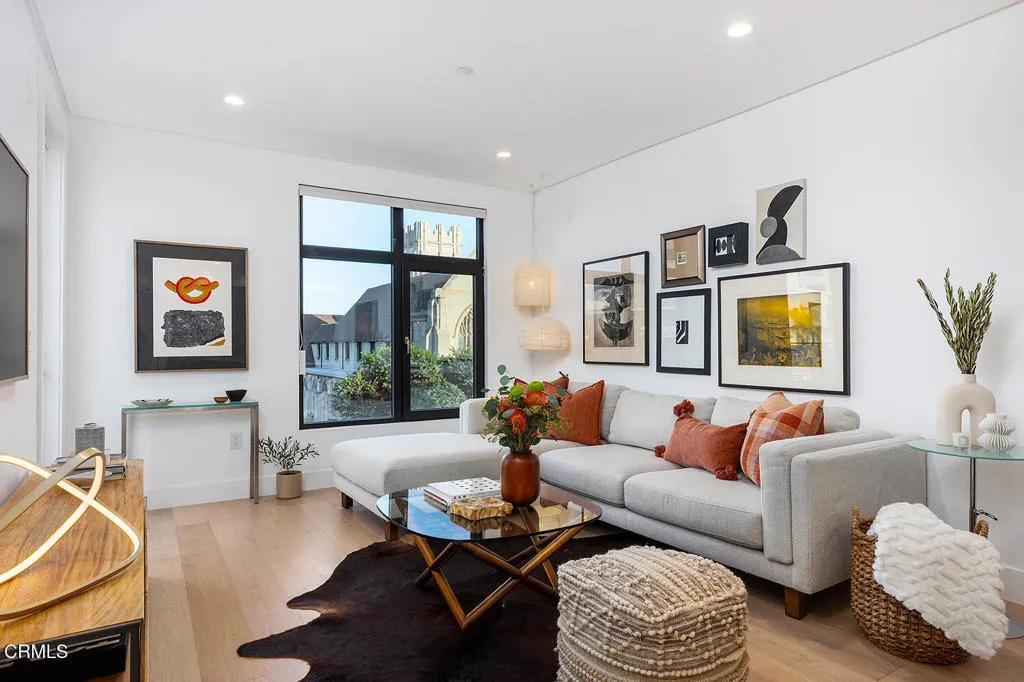 Welcome home to The Del Mar in the heart of Pasadena. This 1,380 square foot top-floor luxury condo boasts two bedrooms, two full bathrooms and two balconies. This unit spans the third and fourth floors, providing an ideal urban floor plan. Upon entering, find a modern, sleek kitchen to your right with a high-end Sub-Zero refrigerator, Wolf range, quartz countertops and designer cabinetry. Engineered oak hardwood floors sooth underfoot as you move past the kitchen into your dining area and loft-like living space. A large picture window captures your attention at the end of the room–drawing you to the architectural views of the church across the street. As you approach, there’s a glass door to the lower-level balcony. Step out to discover breathtaking views of the San Gabriel mountains and nearby cityscape. Envision summer dining al fresco or enjoy morning coffee with the rising eastern sun–and don’t forget cocktails at dusk. Come back inside to find a main-level bedroom with impressive views and an adjoining full bathroom with additional door to connect back to the main space. Also discover a small alcove with more cabinetry and quartz countertop to make the perfect hip bar. Opposite find a door concealing your in-unit stackable laundry equipped with a Samsung washer/dryer. Doubling back to the entry there is a closet for large storage items and staircase leading to the upper level owner’s suite. At the top of a light-filled upper landing, turn to the left to enter a spacious primary bedroom with large window and glass door to your private upper balcony with panoramic mountain views. It’s the perfect place to chill and take in the evening city lights or star gaze. Come back inside to find a spacious en suite bathroom with separate shower and tub and double vanity–all with high-end fixtures. Through the bathroom is a massive closet–decked out with a custom Avera storage system from The Container Store.Entertaining doesn’t end in your condo. The building’s amenities include a community pool, fire pit, barbecue and picnic area. Also enjoy the fitness center, dog park, lounge and meeting room. The Del Mar is a gated community. This unit comes with two side-by-side parking spaces in the underground community parking garage. With such well-appointed finishes and features, this condo and complex doesn’t disappoint–perfect for the modern enthusiast who loves sleek design, the urban landscape, mountain views and California living.