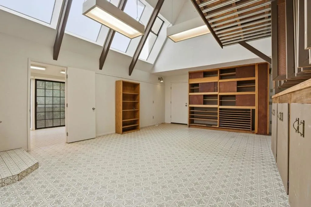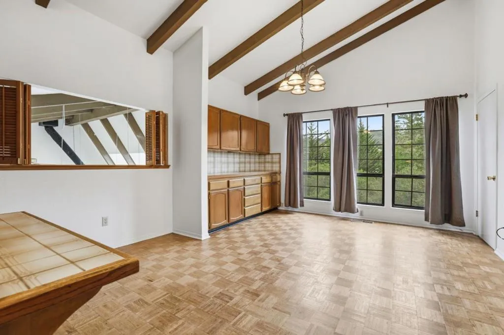 Set on 2.5 acres in the York Hills community of Monterey, 23725 Determine Ln pairs a serene natural setting with distinctive architecture and expansive interior volume. Vaulted ceilings, exposed beams, large picture windows, and multiple balconies frame hillside and treetop outlooks throughout the two-level layout. The upper-level dining and family rooms flow to a wide rear deck, creating an elevated outdoor living extension. The kitchen carries custom details, including a stained-glass hood accent and a shuttered pass-through. An impressive artist studio features soaring ceilings, a wall of skylights, and a freestanding stove, offering an inspiring retreat for creative or flexible use. The upstairs primary suite includes a generous closet array and a French-door balcony. Full-size laundry room, and attached two-car garage with extra driveway parking. The property sits close to York School and short distance to dining, groceries, and Highway 68 access.