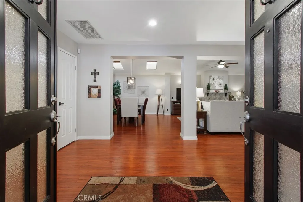 The spacious primary suite includes a walk-in closet, a slider to the patio, and a luxurious bath with double sinks, granite counters, and a walk-in shower with custom tile, granite and a seat. Additional highlights include skylights, updated fixtures, ceiling fans, nice interior/exterior paint, and newer HVAC and water heater.