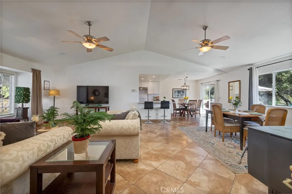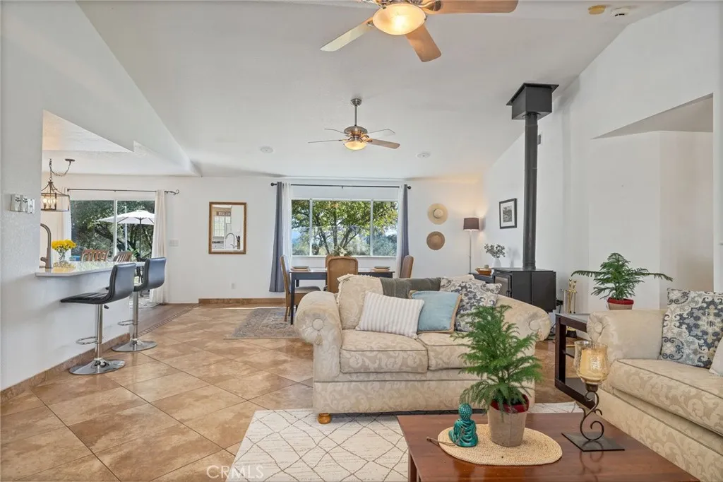 Step inside to discover vaulted ceilings, abundant natural light, and a spacious open floor plan. The updated kitchen features a custom bar, sleek QUARTZ COUNTERS, and a large pantry for ample storage, flowing seamlessly into the dining area—where you can enjoy distant mountain VIEWS from your table. A cozy wood stove adds warmth and charm to the living space.