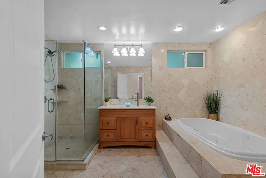 Welcome to this spacious, recently updated 4-bedroom, 2-bathroom pool home, ideally located south of Ventura Blvd on a quiet Woodland Hills cul-de-sac. Featuring fresh paint, upgraded floors, a nest AC , and a newer saltwater pool, this home blends comfort with modern style.The light-filled living room highlights a dramatic floor-to-ceiling stone fireplace and an open layout that flows into a kitchen with stainless steel appliances, plenty of cabinetry, and a versatile dining space, perfect for entertaining or a home office.The main level includes three bedrooms and a spa-like marble bath with an oversized jacuzzi tub. Upstairs, the private primary suite features double vanities, a walk-in shower, and a serene retreat feel.Step outside to a lush backyard oasis with a covered patio and sparkling pool, creating the perfect setting for summer gatherings or peaceful mornings. Just minutes from top-rated schools, shopping, dining, and hiking trails