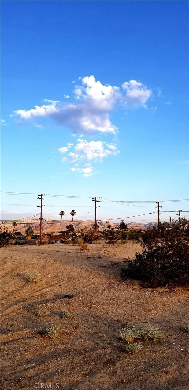 Commercial Corner lot on Adobe Road in the Downtown area of 29 Palms. Heavy traffic flow and great visibility. Sits close to the Historic Plaza and the USMC Military Base as well as the new Turtle Rock Casino and the East Entrance to the Joshua Tree National Park. All utilities are available and has nice views from this elevated spot.