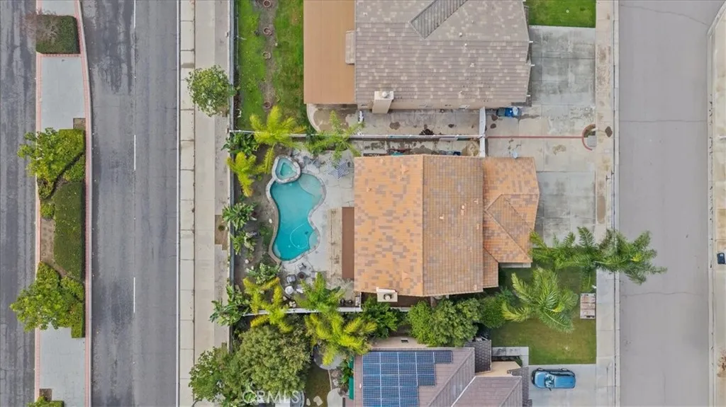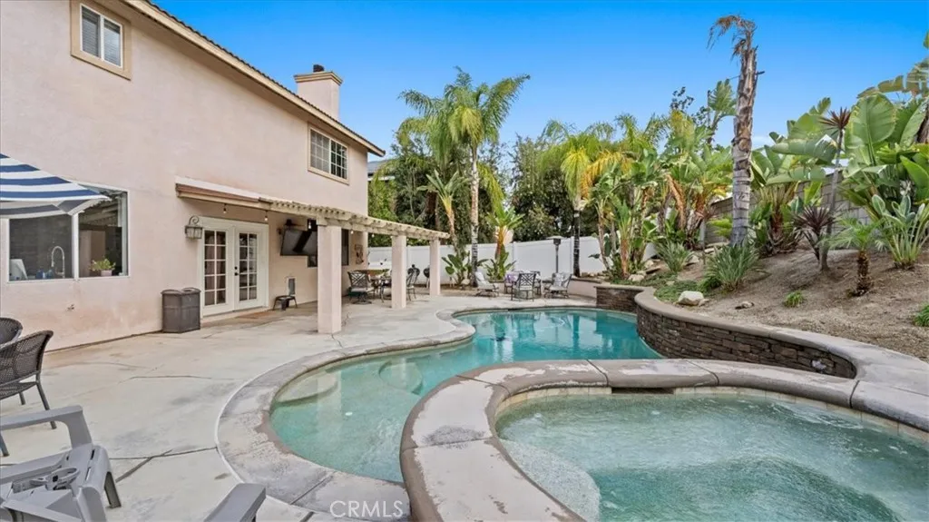 Out back, escape to a resort-style oasis: a custom in-ground pebble-tech pool with raised spa, stacked-stone spillway, and mature tropical landscaping including palms and birds of paradise. The backyard also offers an extended concrete patio, full vinyl fencing, retaining wall, and irrigation system for low-maintenance enjoyment.