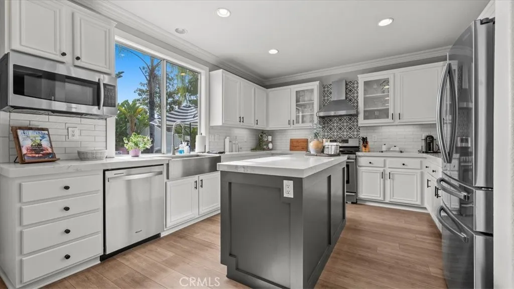 Step inside to find wide-plank luxury vinyl flooring and detailed crown moulding throughout. The spacious kitchen features white shaker cabinets, quartz countertops, a charcoal-toned island, and a striking tile accent wall behind the gas range and stainless chimney hood. A large stainless farmhouse sink sits below a picture window with views of the private backyard. Enjoy a modern layout with open flow between kitchen, dining, family, and living rooms.