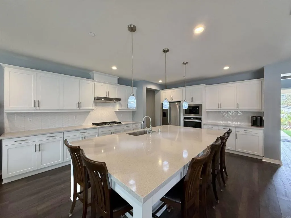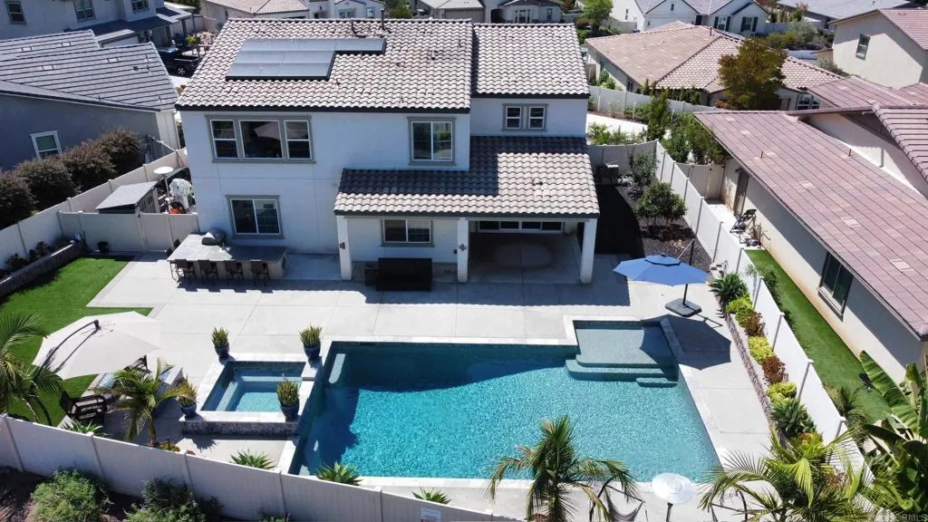 The most compelling offer is presented here. Validate the value and discover for yourself that this is an exceptional opportunity for the astute and discerning buyer to acquire this picturesque California modern mission-style residence. Situated in a cul-de-sac within the renowned and charming gated Oak Creek community of twenty-four spacious homes without Mello-Roos. This meticulously designed residence features custom finishes seamlessly integrated throughout its spacious five bedrooms and four bathrooms, including an en-suite on the first floor. This turn-key move-in ready home features a gourmet chef kitchen, large island, walk-in pantry, dining space, and spacious laundry room with sink. It is generously equipped with solar and EV connections, providing ample natural light, an open floor plan, high ceilings, a robust security system, and ample storage capacity. The owner suite includes a beautiful en-suite with separate dual vanities and walk-in closets as well as a bathtub overlooking the greenery of Vista’s natural preserve. The property offers breathtaking northern views of the greenbelt foothills, stretching from the hilltop to Buena Creek. The expansive property offers ample outdoor entertainment, including the availability of a heated saltwater pool, spa, and modest waterfall. A fully fenced entertaining property features exceptionally manicured landscape, fruit trees, covered patio, natural gas fire pit, and an outdoor kitchen offering, mini-fridge, bar sink, ice maker, grill, and plenty of counter space. This home is conveniently located in close proximity to a major highway, allowing for easy access to downtown Vista, golf courses, nearby parks, recreational facilities, a variety of shopping and dining options, and the beautiful beaches of the southern west coast.
