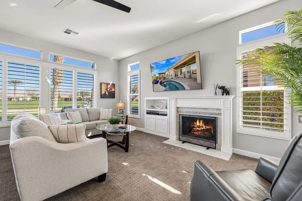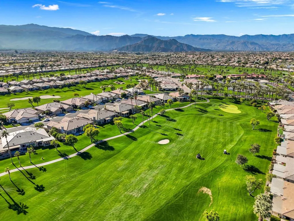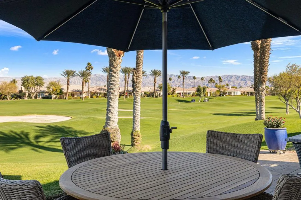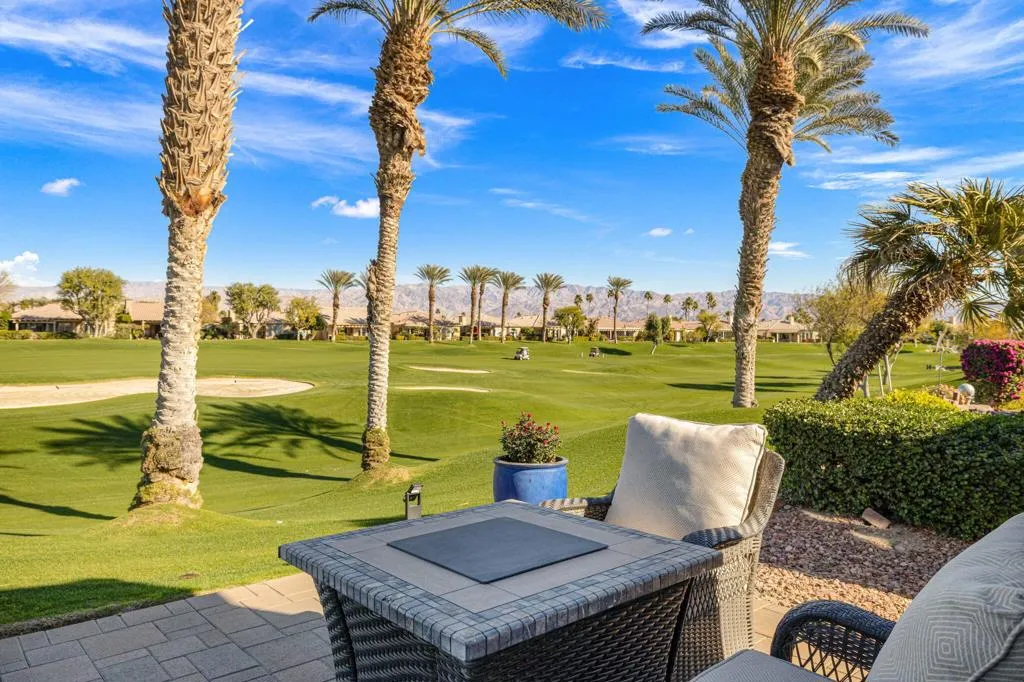 Welcome to Heritage Palms, a community for those ages 55 and over. This South Hampton model on the fairway of hole 17 sits in a the perfect spot for a 180 degree view of the Arthur Hills design course and both San Jacinto and Shadow Mountains. This wonderful open floor plan with 10 foot trayed ceilings is offered turnkey furnished and features two bedrooms, a den/office, and two bathrooms and boasts pride of ownership throughout. This impeccable home is move-in ready and has loads of wonderful updates which include a kitchen make-over with new high-end cabinetry, stainless steel appliances and granite slab counters. The spacious primary bathroom has been updated with tile shower and floors, new vanity, and two custom walk-in closets. In addition to plantation shutters on all windows, new light fixtures and ceiling fans were just added. The home gives you outdoor areas in both the front and back of the house when you are seeking sun or shade. Both patios, driveway, and walkway are finished with paver stones giving it great curb appeal and designer look. The large 10 foot sunken spool is great for those hot days when you want to cool off and for the cold nights when you want to recover from a day of golf or tennis/pickleball with friends. Outside, the yard has been updated with low maintenance, drought tolerant landscape keeping water bills low and yard work a breeze. The garage features a golf cart nook, epoxy floors and built in cabinets to keep your things clean and organized. Heritage Palms is a resident owned club and offers lots of amenities – Private golf course, pickleball, tennis, driving range, restaurant, billiards and may social clubs and activities. This is truly a fantastic home in a wonderful community that has everything you need to make moving easy. The house has been rented frequently in 2025. Call today for your private showing. Buyers to pay one time fee of $1200 to the Heritage Palms Capitol Reserves. Buyers are also responsible for a Reserve Replenishment Fee equal to 6 months of HOA dues that is payable to the HOA within 9 months of closing escrow.