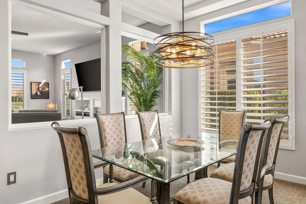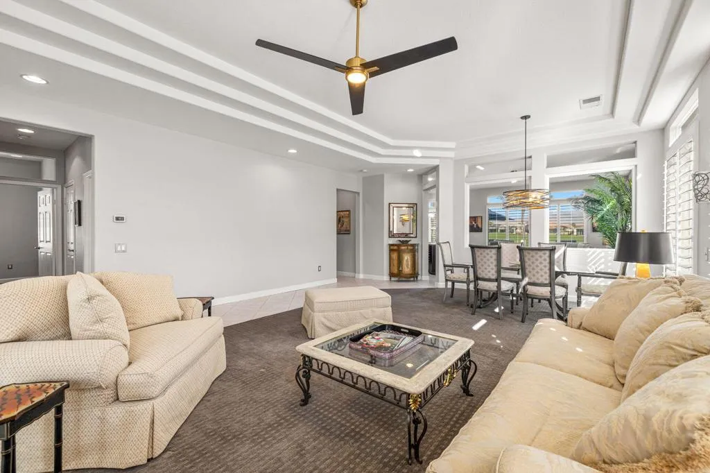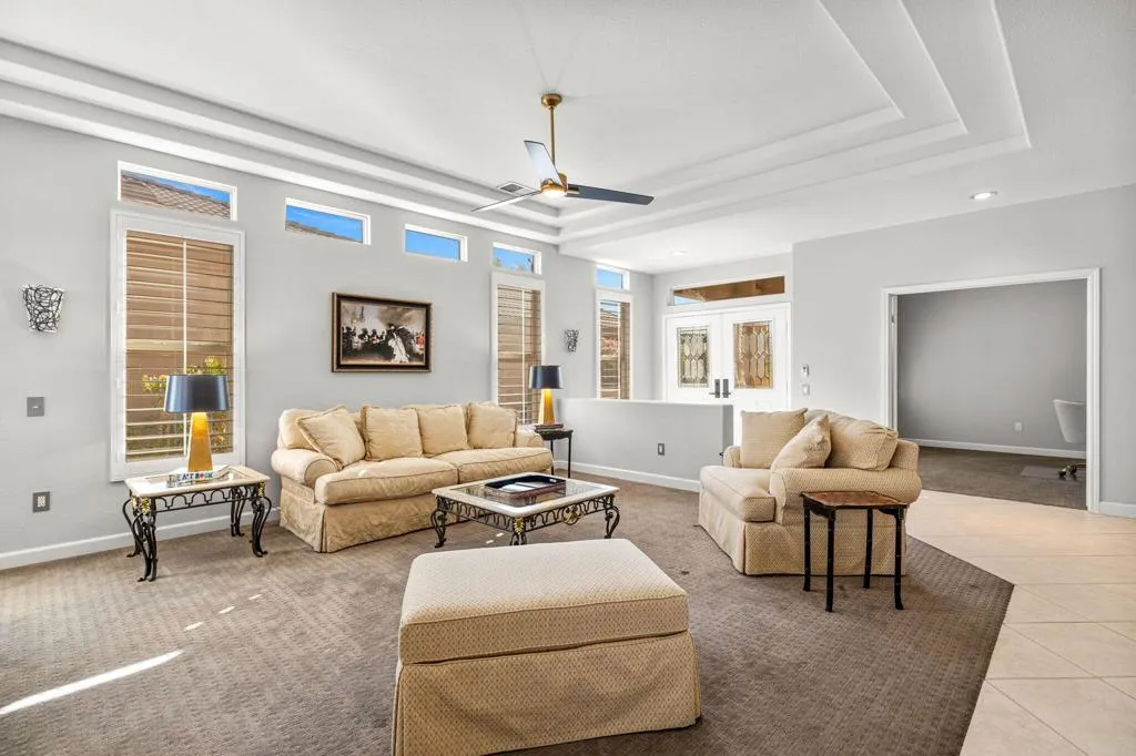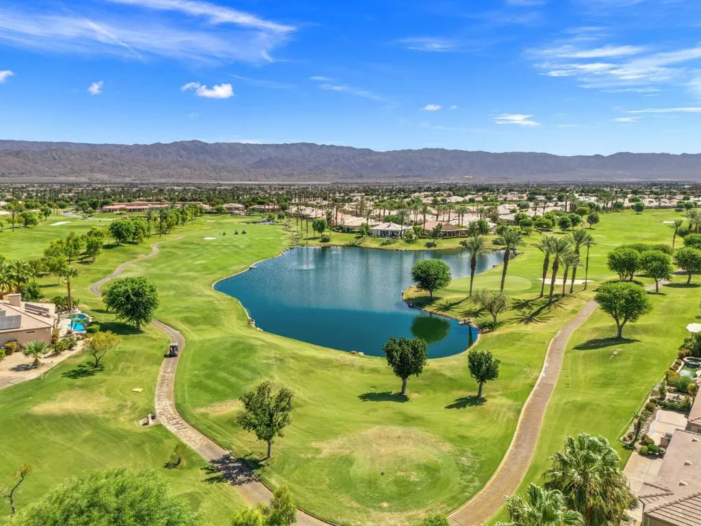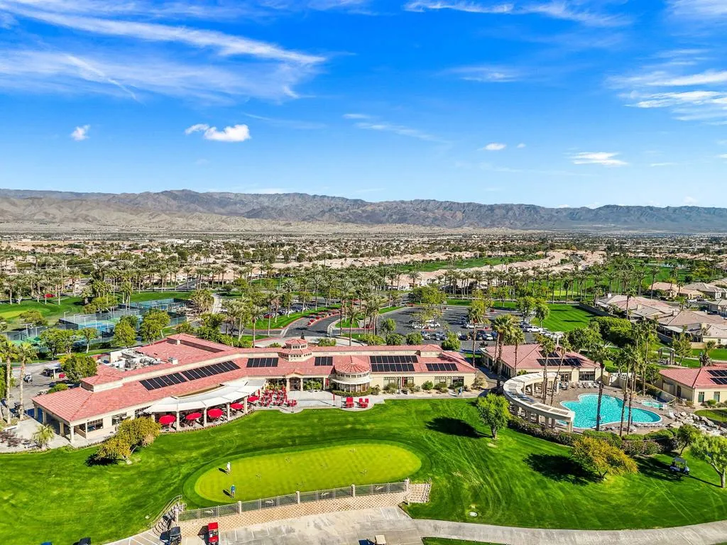 Welcome to Heritage Palms, a community for those ages 55 and over. This South Hampton model on the fairway of hole 17 sits in a the perfect spot for a 180 degree view of the Arthur Hills design course and both San Jacinto and Shadow Mountains. This wonderful open floor plan with 10 foot trayed ceilings is offered turnkey furnished and features two bedrooms, a den/office, and two bathrooms and boasts pride of ownership throughout. This impeccable home is move-in ready and has loads of wonderful updates which include a kitchen make-over with new high-end cabinetry, stainless steel appliances and granite slab counters. The spacious primary bathroom has been updated with tile shower and floors, new vanity, and two custom walk-in closets. In addition to plantation shutters on all windows, new light fixtures and ceiling fans were just added. The home gives you outdoor areas in both the front and back of the house when you are seeking sun or shade. Both patios, driveway, and walkway are finished with paver stones giving it great curb appeal and designer look. The large 10 foot sunken spool is great for those hot days when you want to cool off and for the cold nights when you want to recover from a day of golf or tennis/pickleball with friends. Outside, the yard has been updated with low maintenance, drought tolerant landscape keeping water bills low and yard work a breeze. The garage features a golf cart nook, epoxy floors and built in cabinets to keep your things clean and organized. Heritage Palms is a resident owned club and offers lots of amenities – Private golf course, pickleball, tennis, driving range, restaurant, billiards and may social clubs and activities. This is truly a fantastic home in a wonderful community that has everything you need to make moving easy. The house has been rented frequently in 2025. Call today for your private showing. Buyers to pay one time fee of $1200 to the Heritage Palms Capitol Reserves. Buyers are also responsible for a Reserve Replenishment Fee equal to 6 months of HOA dues that is payable to the HOA within 9 months of closing escrow.
