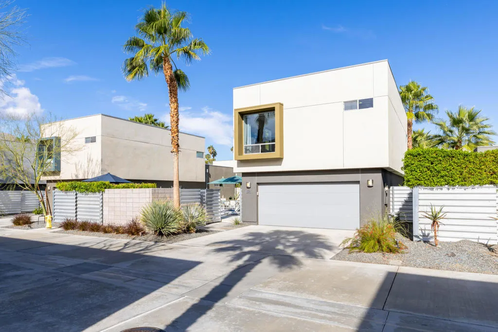 Welcome to this beautiful contemporary home in the highly desired gated community of The Morrison. This lovely three-bedroom, three-bathroom home boasts an open floor plan featuring a spacious great room with a living and dining area, 10 ft. high ceilings and dual, cornered Fleetwood sliding glass doors that open up to the outdoor patio, pool & spa. Other main level features include a bedroom/den with patio/pool access and an adjacent full bathroom, luxurious Porcelanosa tile flooring, a Chef’s kitchen with Viking appliances, Caesarstone countertops, Hans Grohe fixtures, new ice-maker, stackable washer/dryer and ample storage space under the stairs. The entire home interior, including the garage, has been freshly painted. The impressive upper-level primary suite showcases lovely mountain views, a walk-in closet, and a spa-like primary bathroom with dual vanities, a large double shower and soaking tub. Rounding out the top floor is a second bedroom with ensuite bathroom and mountain views. Enjoy the spacious, private patio area that is perfect for entertaining, featuring custom pavers, professional landscaping (new lighting & irrigation), a lovely pool and spa, and a built-in gas fire pit. The 2-car garage has epoxy flooring, a newer tankless water heater and water softener & filtration systems. The roof was resurfaced 2 years ago and both A/C units were newly replaced. The Morrison homes are on fee land (you own the land), have low HOA dues, which include building property insurance and earthquake insurance. The community’s premier location is close to downtown and all that Palm Springs has to offer. Being sold fully furnished (per inventory list). Don’t miss this beautifully appointed home in the gated community of The Morrison in heart of Palm Springs.