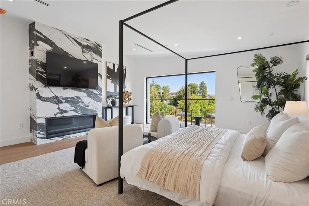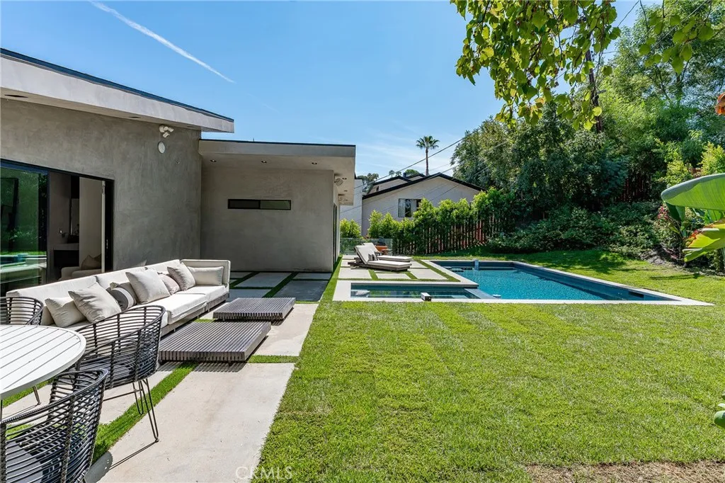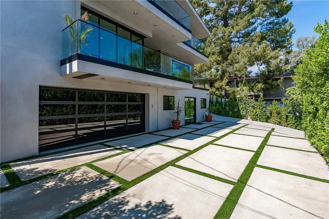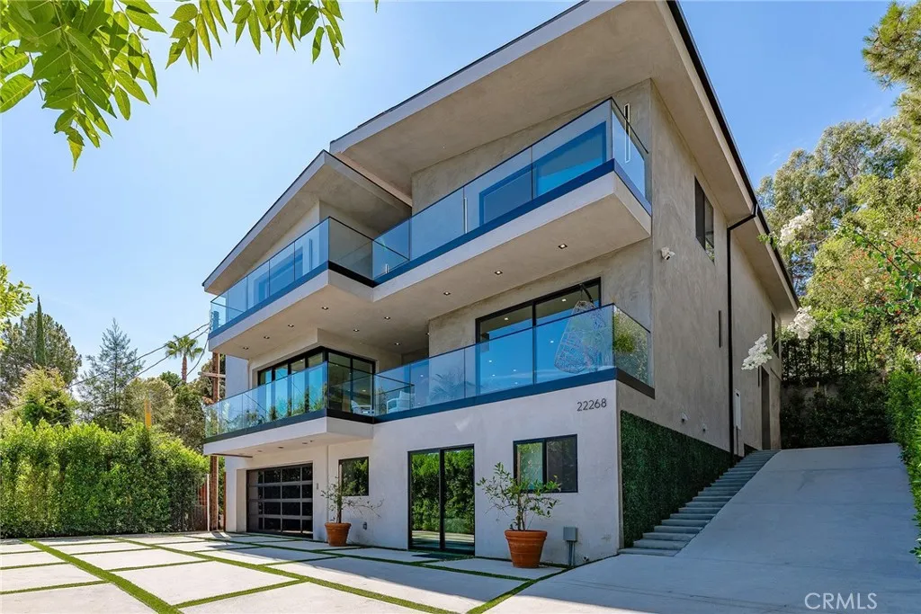 Gated modern estate newly constructed in 2024 with just completed brand new pool & spa located South of the Boulevard with Valley, mountain, & city light views! Privately tucked away and hidden from the street, the property is situated down a long gated driveway with pedestrian access and flanked by tall growth hedging. Oversized parking can accommodate 10 cars plus there is direct access to an extra deep 540 SF 2-car garage. The interiors boast meticulous craftsmanship, designer finishes, and almost every room looks out to gorgeous views. A glass pivot entry door opens to a grand foyer where you’ll find a completely open floor plan filled with natural light from sweeping glass doors that open to the vistas beyond. The chef’s gourmet kitchen boasts massive center island with breakfast bar seating, stainless gourmet appliances, custom soft close cabinetry with quartz counters, separate wine fridge, and great pantry space. The kitchen opens directly to all living spaces including the formal dining room, the spacious family room with stone fireplace, and separate separate den – all rooms highlighted by glass pocket doors & sliders that open to a sprawling wraparound balcony deck with seating area that overlooks the amazing Valley & mountain views. A lower level movie theater has a full bathroom, access to the exterior, and can alternatively be used as a guest suite. Ascend a stunning floating glass and iron staircase to the upper level where you’ll find four well appointed bedrooms including the luxurious primary suite featuring stone fireplace, pocket doors that open to a balcony deck overlooking the gorgeous views, expansive walk-in closet, and sumptuous en-suite bathroom with custom floating vanity with dual sinks, designer tiling, walk-in steam shower with multiple shower heads, soaking tub, and separate toilet room. The three additional bedrooms have walk-in closets and access to their own bathrooms. Two of the rooms have large sliders that open to the backyard and the other opens to a large balcony deck overlooking the views. The resort styled backyard features brand new pool and spa, large wraparound patio for lounging and outdoor dining, BBQ center, and grass lawns with lush landscaping. Desirably located adjacent to dining & shopping at the Calabasas Commons, Topanga Canyon shops/eateries, Westfield Topanga Mall/Village, Warner Center, hiking trails & minutes to Malibu. Also available for sale for $3,595,000.