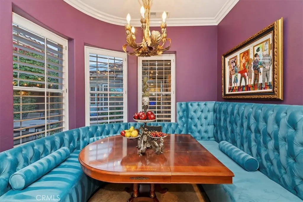 The gourmet kitchen features granite countertops, beautifully painted cabinetry, a built-in refrigerator, double ovens, stainless steel appliances, walk-in pantry, a a large center island with it’s own cooktop, and a custom built breakfast nook.