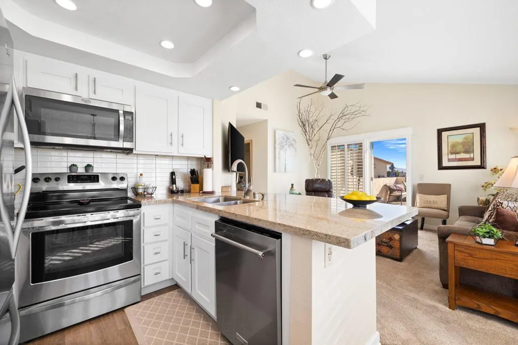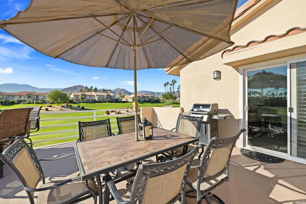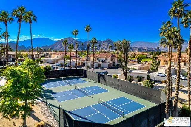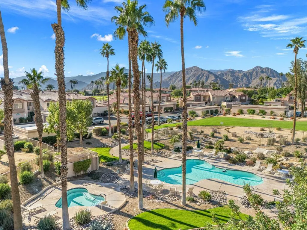 This upper-level view property is in a premium location with views in every direction. The balcony offers breathtaking views of fairways, lakes and mountain ranges. The interior features a great room floor plan with vaulted ceilings. The highly upgraded kitchen features custom cabinetry, granite counters, custom tile backsplash and newer stainless appliances. The kitchen is open to the living area. Both baths have been extensively upgraded with custom tile enclosures, newer cabinetry and granite counters. The guest bedroom is versatile and features office furnishings. This condo features luxury vinyl planking in the dine area. Decorated in warm neutral colors this property is offered furnished per inventory. With energy-efficient vinyl doors and windows the property combines luxury with sustainability. A new HVAC system was installed in 2025, and ceiling fans and shutters enhance efficiency. New water heater installed in 2025. Newer washer/dryer located in the unit. The inclusion of a 1-car garage adds practicality to the package. The complex’s amenities include 6 community pools and spa areas, to provide ample opportunities for relaxation and recreation. The added perk of UNLIMITED golf on a Ted Robinson designed par 3 course. Featuring tennis and pickleball courts that are well maintained. Now the area headquarters for Helix Disc Golf, enhances lifestyle appeal. Low HOA dues covering essential services, cable, and internet make for worry-free living, while convenient access to shopping, dining, and transportation adds to the property’s allure. Situated across from the Indian Wells Tennis Gardens, home of the Paribas Open, this property is perfect for either full-time residence or a luxury seasonal home. Overall, it truly offers a lifestyle of convenience and luxury, appealing to those seeking the ultimate in comfort and relaxation.