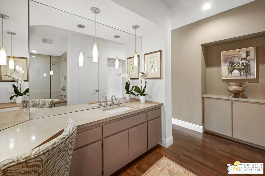 Welcome to the best that Desert Falls Country Club has to offer. This designer remodeled 2 split bedrooms, 2 bath, ground floor condo features crown molding, oversized baseboards, updated cabinetry, quartz and stainless kitchen, custom gas fireplace, and uniform high-end flooring throughout the owners’ retreat features separatewalk-in shower and jacuzzi tub, generous closets and direct access to the rear patio with sprawling elevated mountain and golf views. The in-unit laundry room provides convenience and storage. At the end of the long driveway, your private 2-car garage is at your front door. The home is located in the center of the community, far from road and traffic intrusions. Desert Falls Country Club offers a variety of membership levels and day play passes for its world-class golf course and facilities. ***Why Aren’t You Living Here Yet?***
