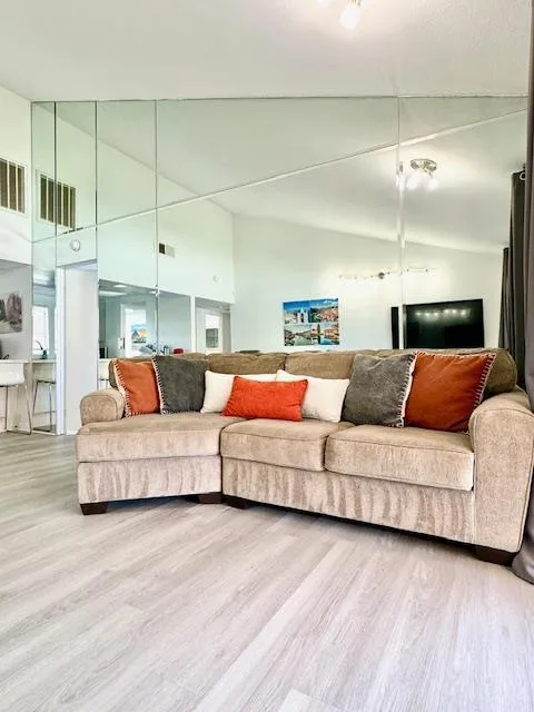 Welcome to your dream home in Palm Desert! This charming residence was recently upgraded. It offers 1,177 square feet of comfortable living space, featuring two bedrooms and two full bathrooms. The kitchen is a chef’s delight with quartz and solid surface/Corian countertops, a skylight, and modern appliances including a microwave, oven range, and refrigerator. The open layout seamlessly connects the kitchen to the family room, creating a perfect space for entertaining. Enjoy the convenience of an inside laundry area, complete with a washer and dryer. The home’s flooring consists of durable tile and vinyl/linoleum, providing both style and easy maintenance. The high and vaulted ceilings that enhance the sense of space. Beautiful view of golf court and pond from the living room and bedrooms on both side. The awning in the backyard will help to provide some shade in the hot season. The swimming pool is conveniently located across the street. This Palm Desert gem is ready for you to move in and start making memories.