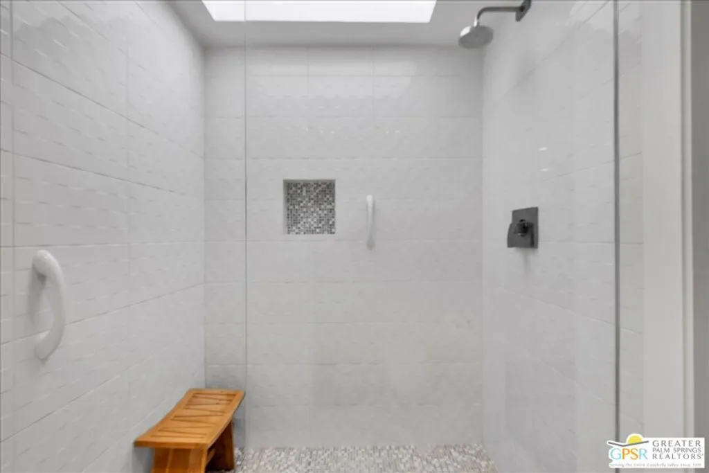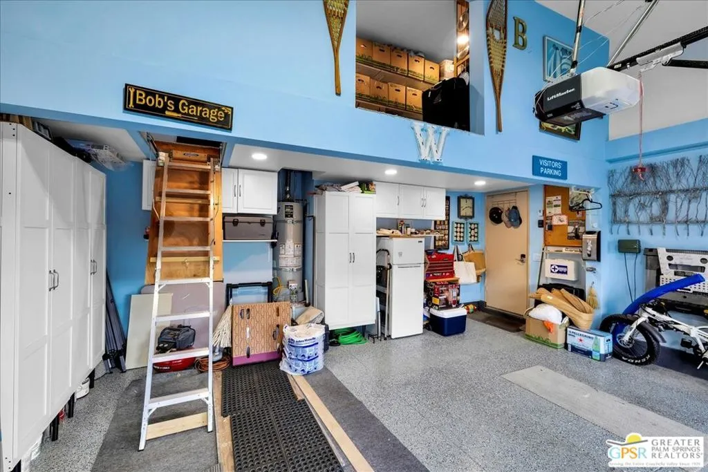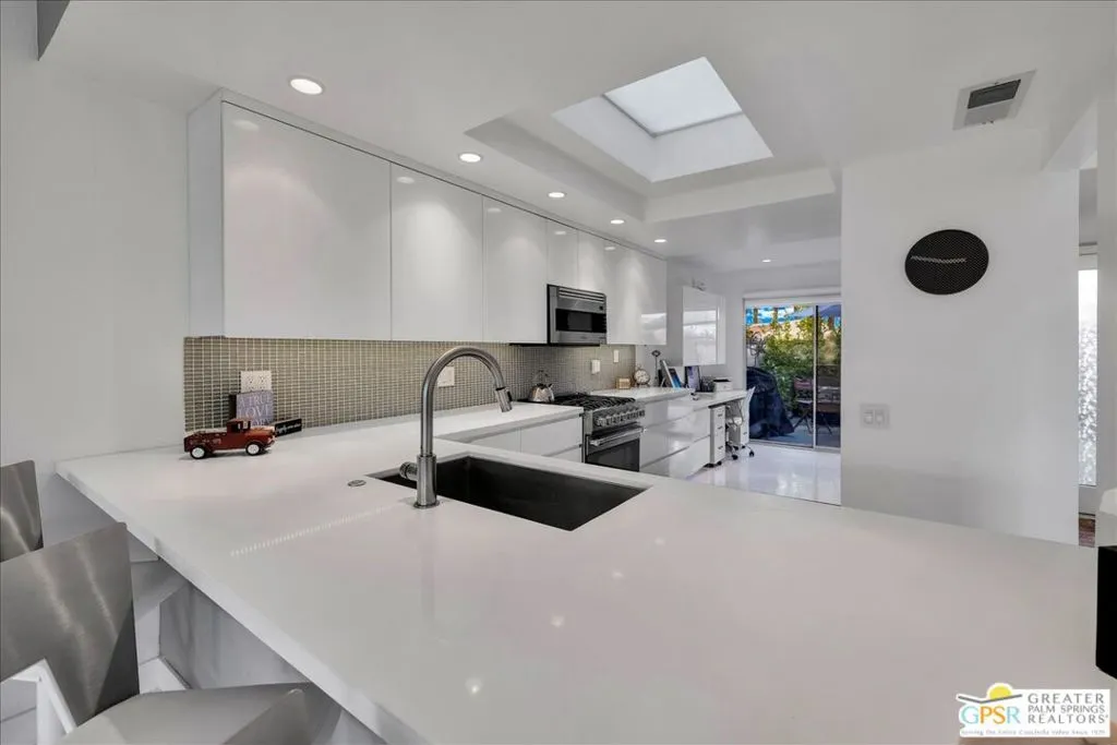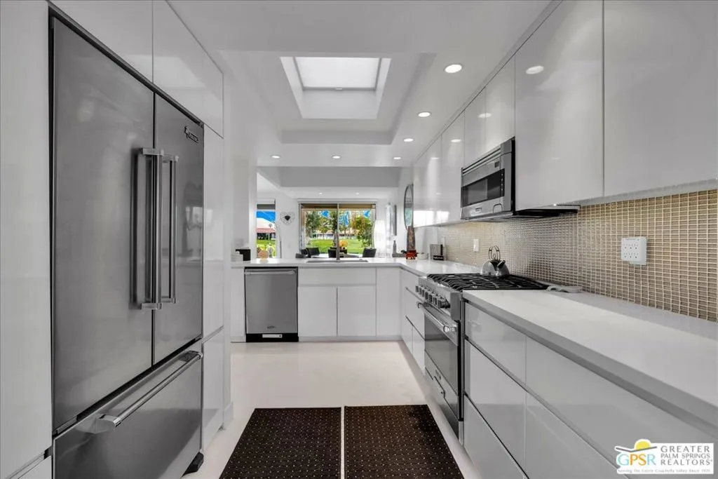 Imagine waking up to sun-drenched mountain vistas on the 6th fairway of Cathedral Canyon’s championship course. This single story 2-bed, 2-bath golf-front gem with a coveted attached 2-car garage is calling you home: no stairs, no neighbors above, just pure desert magic. Step through your spacious private tiled front patio with soft timer lights into vaulted ceilings, skylights, and gleaming white floors flowing through an open floor plan. The beautifully remodeled kitchen showcases Viking appliances, sparkling quartz, custom glossy white cabinetry, and a breakfast bar ready for morning coffee or sunset cocktails. Cozy up to the gas fireplace as natural light pours through a wall of glass leading to your covered rear patio with ceiling fan, recessed lighting, and unobstructed fairway and mountain views, your personal oasis for al fresco dining or stargazing. The primary suite offers a remodeled en-suite bath with a dual vanity and an elegant, spa-inspired tiled shower. The guest bedroom includes a queen Murphy bed and excellent additional storage cabinets ideal for visitors or a comfortable home office. The guest bath is also fully updated with modern finishes and a walk-in shower. Additional upgrades include ceiling fans, custom window coverings, and a newer Samsung washer and dryer. The attached garage features an epoxy floor, built-in cabinetry, and a second-story loft for extra storage. A short stroll takes you to one of the community’s sparkling pools and spas within this secure, gated enclave. HOA includes Wi-Fi, basic cable, trash, sewer, exterior maintenance, roofing, landscaping, and access to six pools and spas. This isn’t just a condo, it’s your desert retreat come to life.