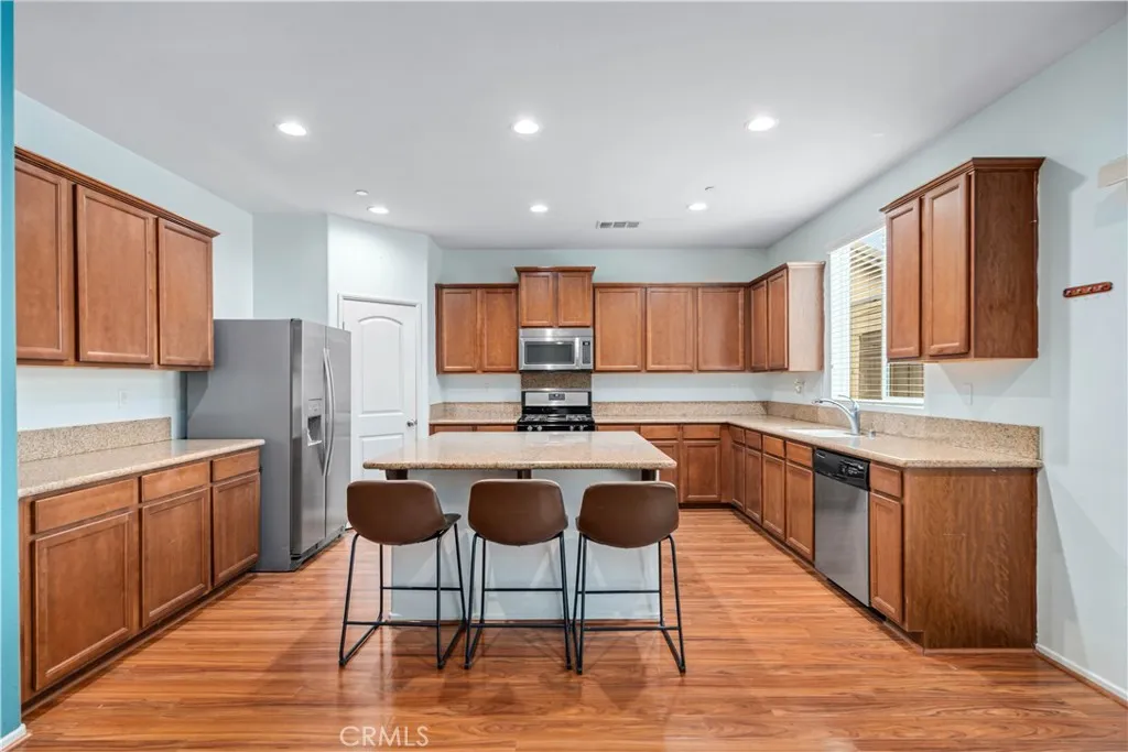 Downstairs features a large bedroom and full bath, ideal for guests or multi-generational living, plus a dedicated office with double-door entry at the front of the home. Enjoy both formal dining and a bright, open-concept kitchen with a center island, stainless steel appliances, walk-in pantry, and generous counter space—all flowing seamlessly into the expansive family room with tall ceilings.
