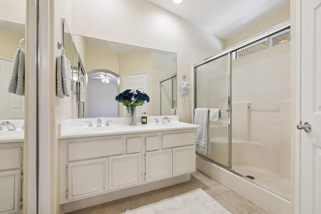 Enjoy the peace, quiet and security of gated Las Brisas N in this freshly painted 4 bedroom, 3 bath home with over 2000 sq ft. Expansive living area features high ceilings, formal dining room, living room, & family room with fireplace. Tile flooring separates family room from kitchen area with space in front of the island to add a casual dining table. Access to the backyard thru French doors allows a wonderful indoor/outdoor entertainment experience. Primary bedroom is spacious with access to the backyard thru it’s own set of French doors. Ensuite bath has dual vanities, walk-in shower, & large walk-in closet. Down the hall there are two more bedrooms and a shared bath. The 4th bedroom and 3rd bath are located at the opposite end of the house near the kitchen and laundry room, perfect for guests or use as an office. The attached 2-car garage is conveniently accessed through the kitchen. Property is beautifully landscaped front & back. Lovely mature shade tree, grass, & verdant foliage in the front yard. The backyard has a concrete patio that extends the length of the house, pergola providing shade, and a huge grass expanse perfect to add a private swimming pool. Located close to Costco, shopping, medical, & downtown events. Low HOA fees.