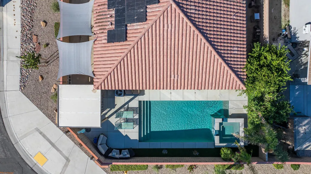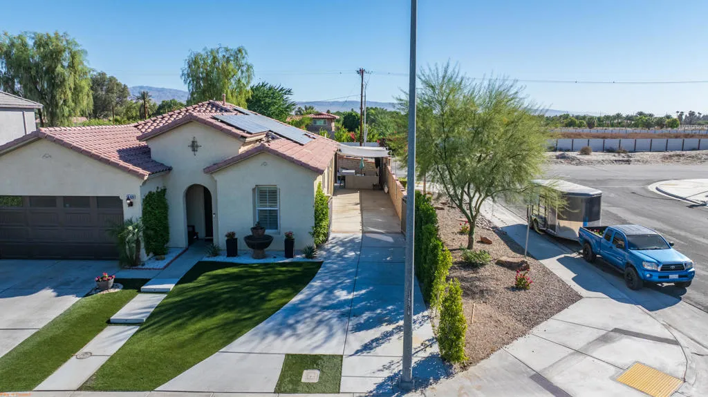 Beautiful semi-custom corner home featuring 10-ft ceilings, tall kitchen cabinets and doors, custom paint, and a gated side entry. Upgraded tile flooring throughout, plantation shutters, and professionally landscaped front and back yards. Property includes owned solar panels, a salt water pool and spa, built-in BBQ area, and a side driveway with RV/trailer access. Newly replaced garage door and Concrete on both sides of the home. Located near Augustine Casino. Perfect corner-lot entertainer’s home! For a faster response, please call or text the agent with any questions.