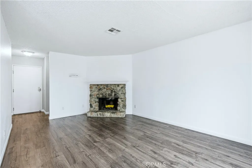 Welcome to Cimarron Ridge, where this 3-bedroom, 2.5-bath view condo offers a peaceful setting and spacious two-story layout. A gated front patio welcomes you into the open living area featuring fresh interior paint, wood-look flooring, and a charming stone fireplace. The kitchen includes stainless steel appliances (refrigerator and stove included) with a dining area framed by bay windows and views of the outdoor greenery. A convenient half bathroom completes the main level. Upstairs, all bedrooms are privately tucked away. The generous primary suite features a double-door entry, vaulted ceiling, sliding door to a private balcony, and relaxing city-lights and treetop views. The primary bathroom includes dual sinks, a remodeled walk-in shower with slab-style walls, and a walk-in closet. Two additional bedrooms share a remodeled ¾ hall bathroom.
