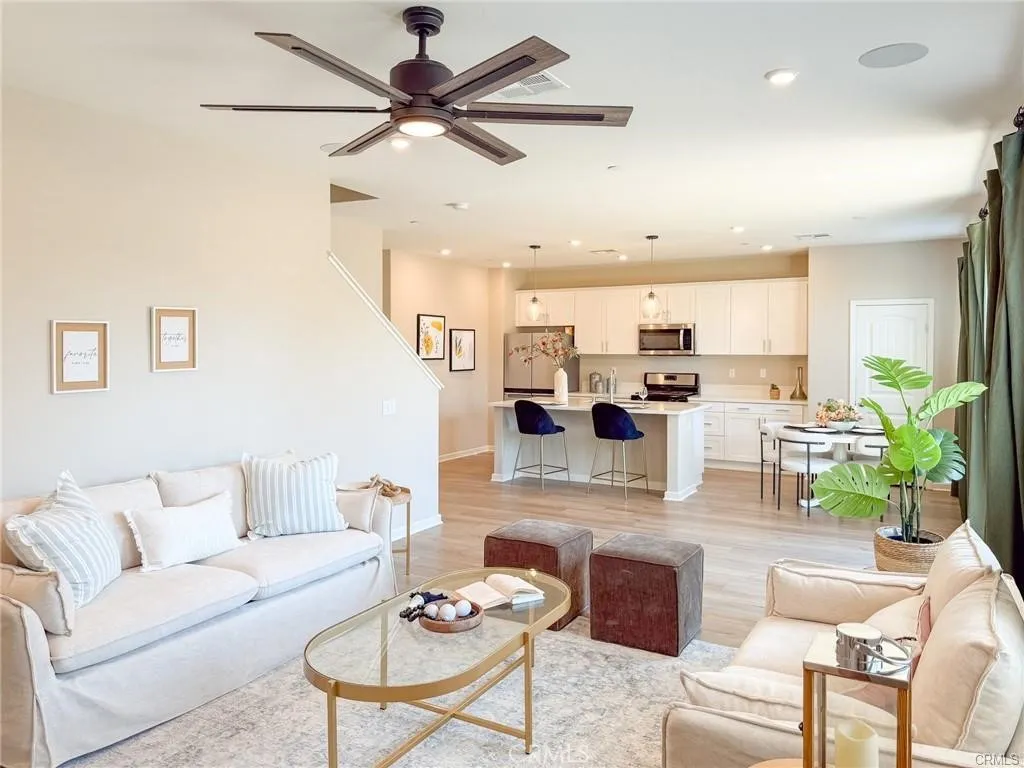 A beautifully maintained former model home located in a desirable gated community in Moreno Valley. Built in 2021, this newer single-family residence offers 4 bedrooms, 2.5 bathrooms, plus a downstairs office and an upstairs loft, providing flexible living space for today’s modern lifestyle. The home features builder-upgraded finishes throughout, including luxury vinyl plank flooring, quartz countertops, stainless steel appliances, and smart-home technology. As the original model, it has been meticulously cared for and remains in pristine condition. The open-concept kitchen with a large center island flows seamlessly into the dining and living areas, creating an inviting space for both everyday living and entertaining. Upstairs, the spacious loft serves perfectly as a secondary lounge, study area, or playroom. The large primary suite includes a walk-in closet and a dual-sink vanity. A fully landscaped backyard offers a private outdoor retreat, while the attached two-car garage provides added convenience. Located in a quiet gated community with amenities such as a pool, playground, and BBQ area, and just minutes from shopping, dining, schools, and major freeways—this home delivers the ideal blend of comfort, style, and accessibility.