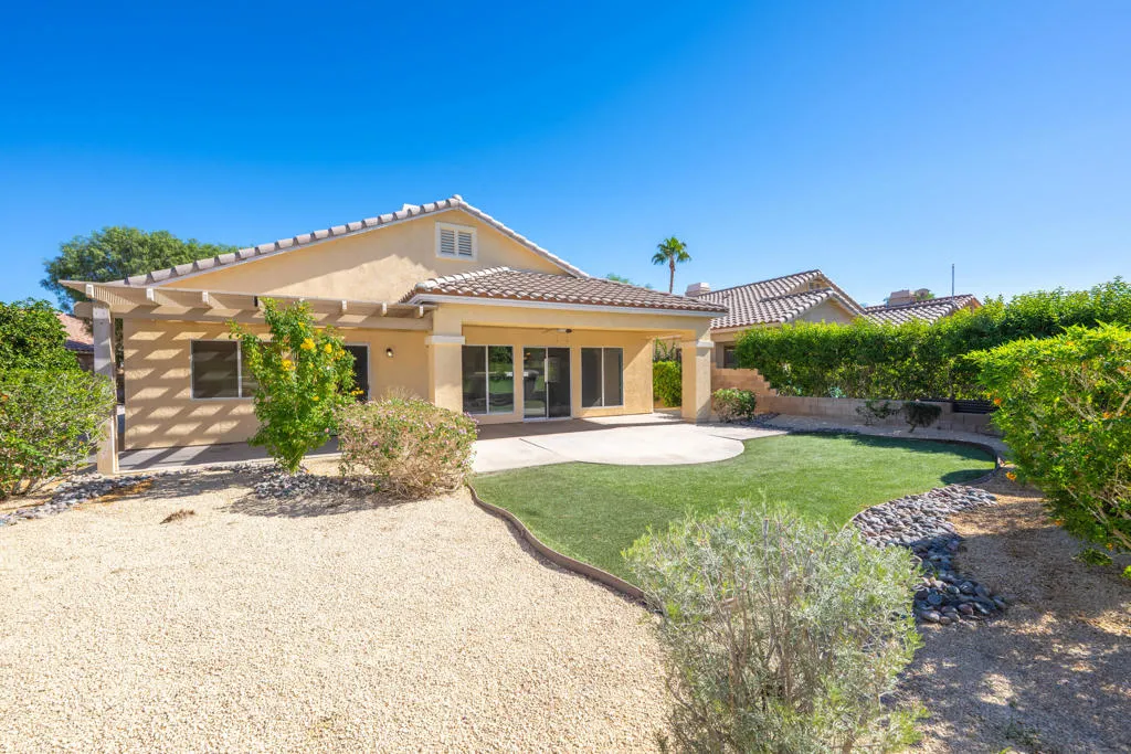 Incredible possibilities await in this freshly painted and newly carpeted Manhattan floor plan, perfectly situated on an oversized 10,000 sf lot overlooking the signature 2nd hole with breathtaking southwestern mountain views! This is one of the largest lots available for a Manhattan, offering ample space and endless outdoor living potential.Expansive courtyards are rare and highly sought-after in Indian Springs–and this one is ready for your grand vision! Imagine creating your dream outdoor living area with a private pool, spa, BBQ, fire pit, putting green, or whatever your desert lifestyle inspires.Inside, you’ll find one of the community’s most popular open floor plans, featuring new flooring and fresh paint throughout. With over 1,980 square feet of living space, this layout includes a spacious kitchen, three bedrooms, and three bathrooms. The 3rd bedroom/guest casita offers fantastic flexibility–ideal for visiting guests, a private home office, or a cozy den. Overlooking the courtyard, both guest rooms offer excellent potential and charm.This home checks all the boxes: spectacular views, a massive lot with room to expand, a desirable floor plan with guest casita, new paint & carpet, and an incredible value! Someone is going to turn this gem into a one-of-a-kind desert retreat–and that someone could be you!Located in Indian Springs, one of the most popular communities in the heart of the desert–close to La Quinta, Indian Wells, and Palm Desert–residents and snowbirds alike enjoy low HOA dues, gated security, and front yard maintenance included. The HOA also provides TV, internet, and access to two residents’ clubs with heated pools, spas, and fitness centers. Plus, you’re just steps from the Big Rock Pub & Golf Clubhouse, offering great food, live entertainment, and golf you’ll love coming back to.If you’re searching for something special with extra space, amazing views, and tons of potential, this is it. Come see it today–homes like this don’t last long!