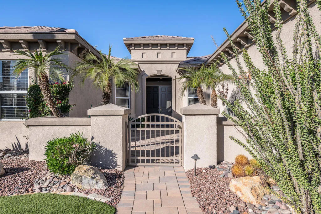Welcome to Heritage Palms Country Club, a premier 55+ community offering resort-style living at its finest. This stunning Glen Eagle Model boasts 2,195 sq. ft. of thoughtfully designed living space and is perfectly situated on an elevated lot overlooking the 17th Fairway and 18th-Hole Tee Box. Conveniently located near the clubhouse, this home combines elegance, comfort, and numerous upgrades throughout. Step inside to find expanded living and dining areas, where large picture windows and electronic window coverings frame breathtaking golf course, mountain, and lake views. A gas fireplace adds warmth and charm, while an open den off the living area offers the perfect space for a home office or guest retreat. The chef’s kitchen is both beautiful and functional, showcasing stainless steel appliances, a gas cooktop, rich wood cabinetry, granite countertops, and a walk-in pantry. A wine refrigerator and ample counter space make entertaining effortless. The primary suite provides a serene retreat with stunning views and a luxurious ensuite bath featuring granite countertops, a walk-in granite shower, a soaking tub, and a spacious walk-in closet. Guests will feel at home in the private guest bedroom with an adjacent bath and walk-in shower. Outdoor living is what desert life is all about–relax or entertain on the back patio while taking in sweeping views, watching golfers play through, or enjoying vibrant desert sunsets. The private front courtyard is ideal for morning coffee or quiet reading, and both the courtyard and driveway have been beautifully upgraded with pavers. Additional highlights include newer windows, updated French doors for improved energy efficiency, tile flooring throughout, carpeted bedrooms, a laundry room with direct access to the garage (including golf cart space), ceiling fans, an attic fan, and surround sound in the living area. Residents of Heritage Palms Country Club enjoy an 18-hole championship golf course, a modern fitness center, indoor and outdoor pools, and active tennis and pickleball programs–all within a beautifully maintained gated community. Experience the best of resort-style desert living–don’t miss your chance to own this exceptional home in Heritage Palms Country Club!