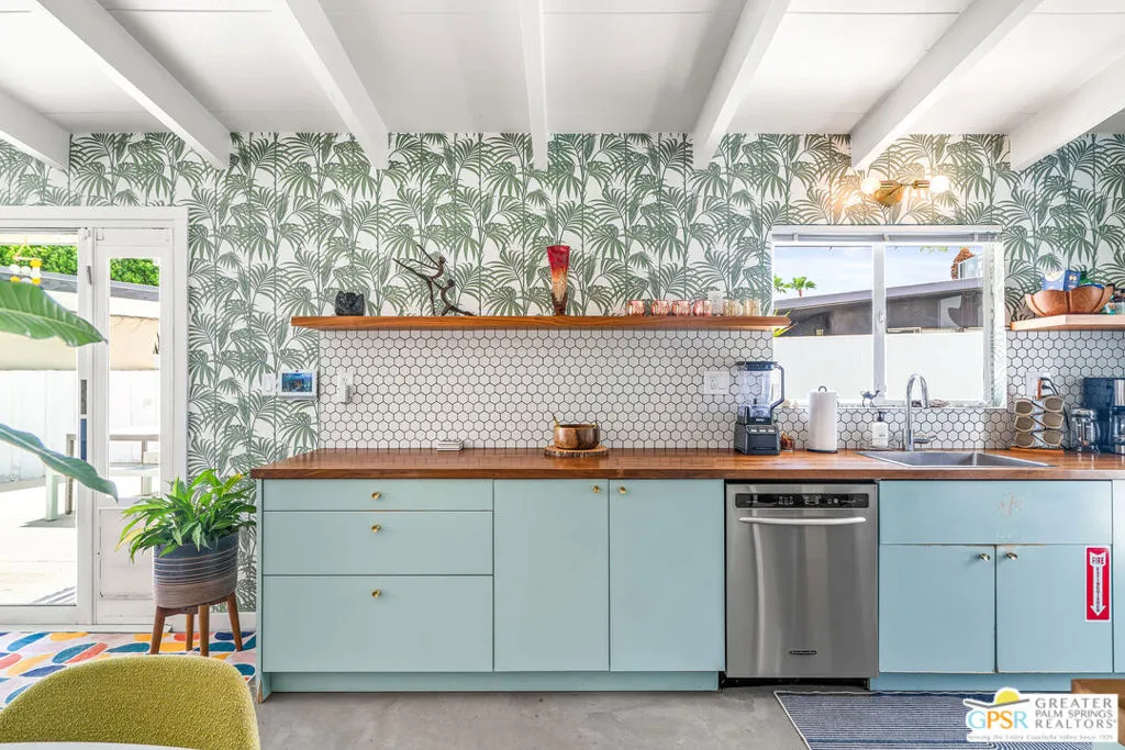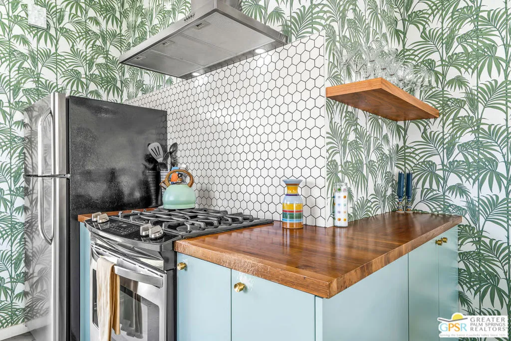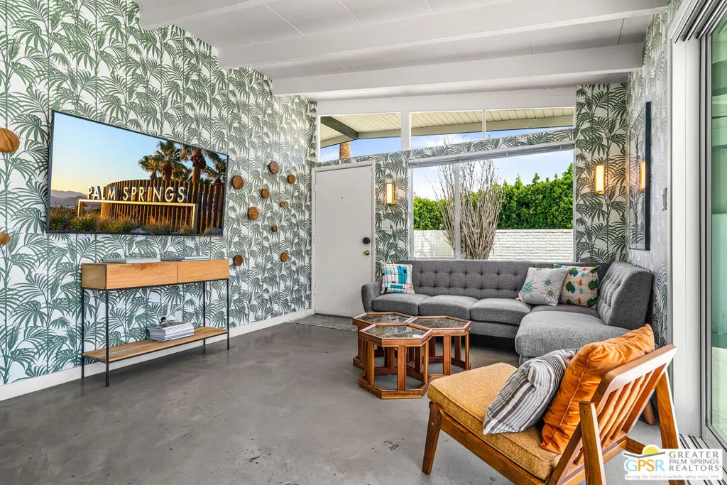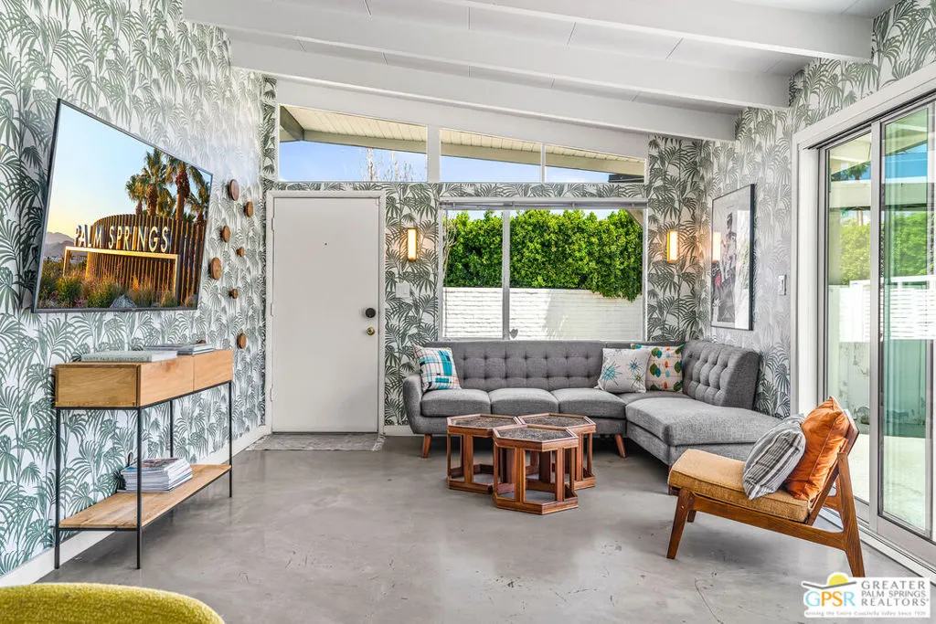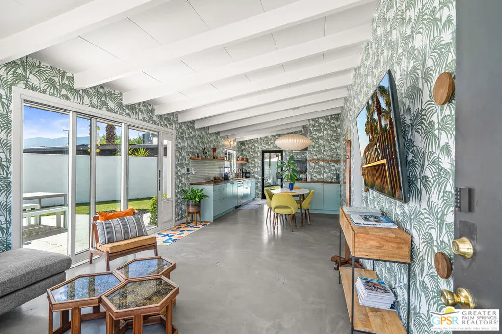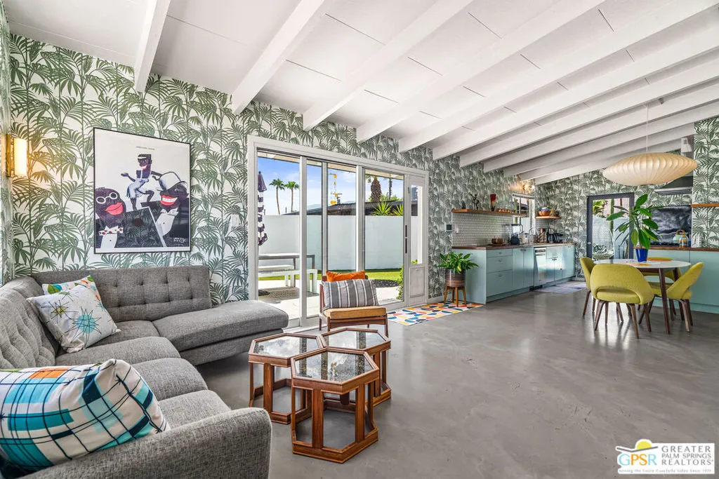 Looking for a unique, well priced mid-century single family home? Ta-da! Updated mid-century, post & beam, tucked away on a private, gated corner lot in the sought-after Movie Colony East neighborhood in Central Palm Springs (close to everything including Ruth Hardy Park!). Designed to embrace light and views, the home features a striking gable roof and clerestory windows that bring the outdoors into every room.The polished concrete floors and open layout create a modern flow, while expansive sliders from nearly every space open directly to the backyard. A modern kitchen and baths showcase custom tile, walnut countertops, stainless appliances, and designer fixtures. Both bedrooms enjoy direct access to the resort-style backyard, where a sparkling and unique pool and spa are framed by refreshed landscaping, fire feature, and multiple spots for dining or lounging under the desert sky. FEE SIMPLE land ownership and NO HOA!! This home captures the essence of Palm Springs living: stylish, relaxed, and unforgettable.