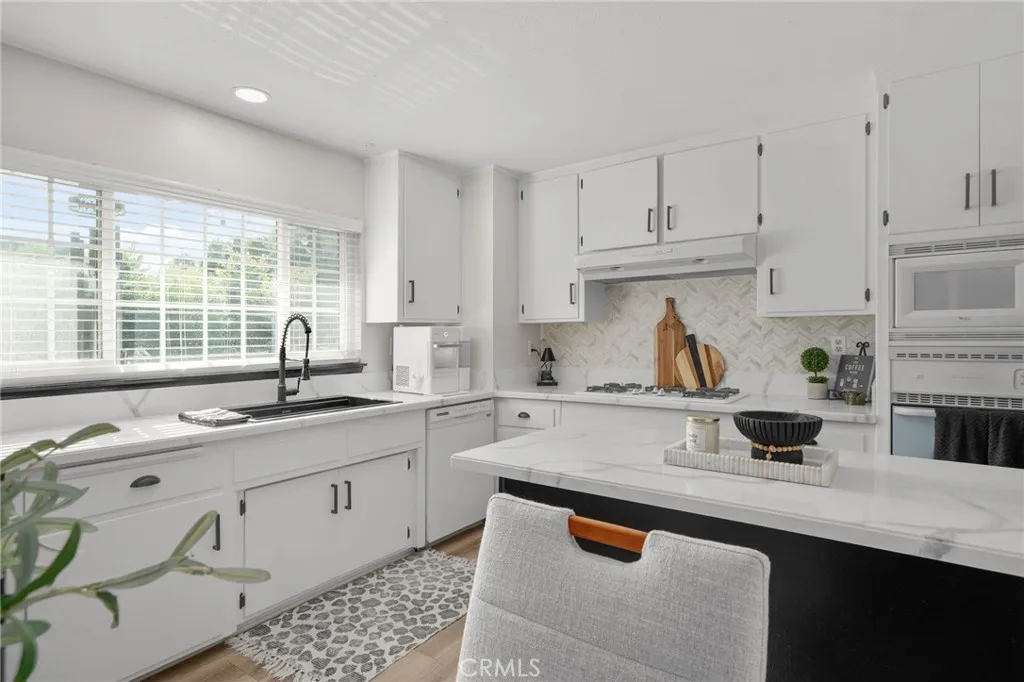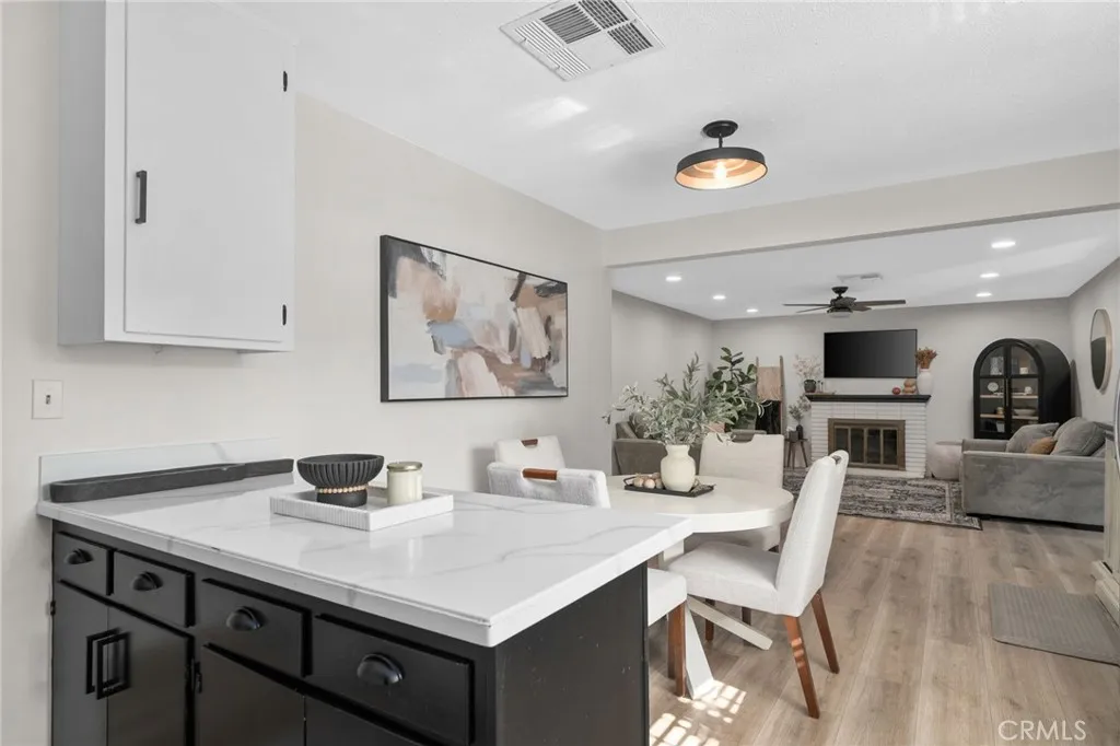 The main living areas feature a bright and comfortable layout that flows easily into the kitchen and dining spaces. The kitchen provides ample cabinetry and clear views of the backyard and pool, creating a pleasant connection between indoor and outdoor living.