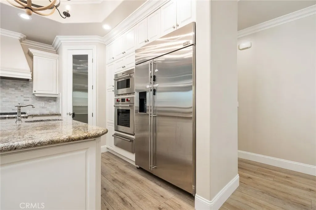 This home offers 3 bedrooms, 3 bathrooms, an office, and a spacious laundry room, all crafted with exceptional detail. At the heart of the home is the gourmet chef’s kitchen—featuring granite countertops, high-end appliances, double ovens, a warming drawer, professional built-in refrigerator, instant hot water, abundant cabinetry, and a bar area with wine refrigerator for effortless entertaining.