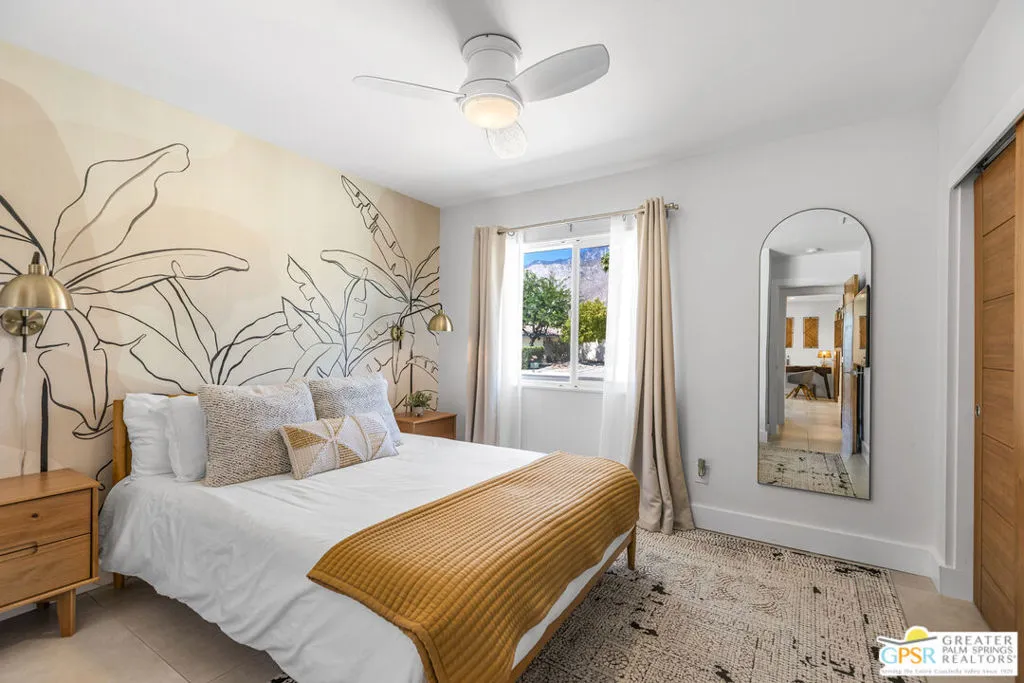 Welcome to the Palm Springs lifestyle, where endless desert skies meet California Cool. Whether you dream of a full-time residence or a successful vacation investment, this stylishly updated, move-in-ready home is perfectly positioned in a central location, just minutes from the downtown Design District, shopping, and award-winning dining. Step inside a flowing, open-concept space designed for effortless entertaining. The chef’s kitchen is the heart of the home, featuring stainless steel appliances and an oversized 8-foot quartz waterfall edge island ideal for culinary creations and casual gatherings. Sleek 17×35 tile flooring throughout provides a seamless cohesive aesthetic. The Primary Suite boasts a custom Elfa closet system, en-suite bathroom with an over-sized walk-in tiled shower and convenient access to the beautiful backyard. Enjoy spectacular sunsets and unobstructed west mountain views from the front patio, screened by a mid-century breeze-block wall, while the backyard is your true resort experience, featuring a pebble-tec pool with integrated spa and a spacious covered patio perfect for year-round relaxation. Currently a successful Airbnb, this property offers an immediate return. Plus, you’ll enjoy lower energy costs thanks to the low-monthly leased solar system. Situated on a cul-de-sac with no power lines in sight. Your turnkey oasis awaits, simply bring your suit and dive into the good life!