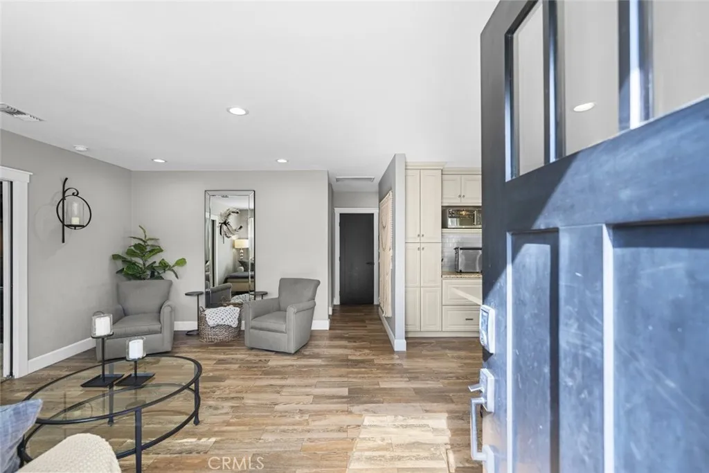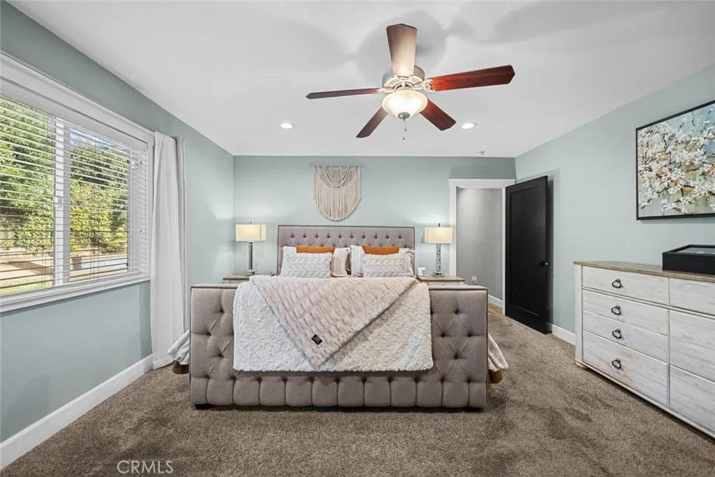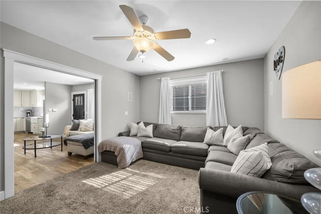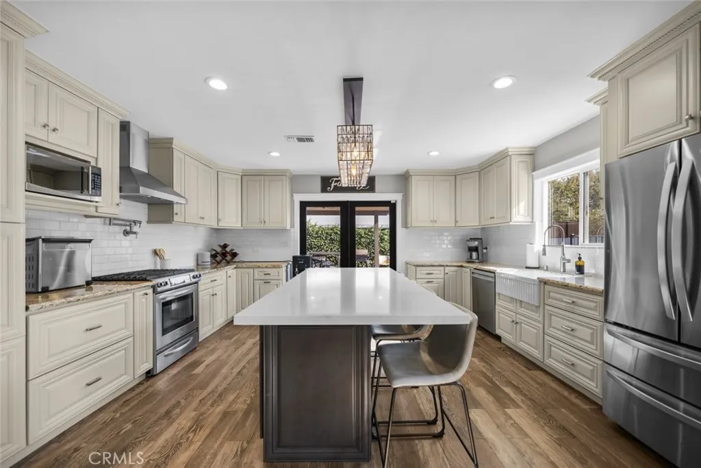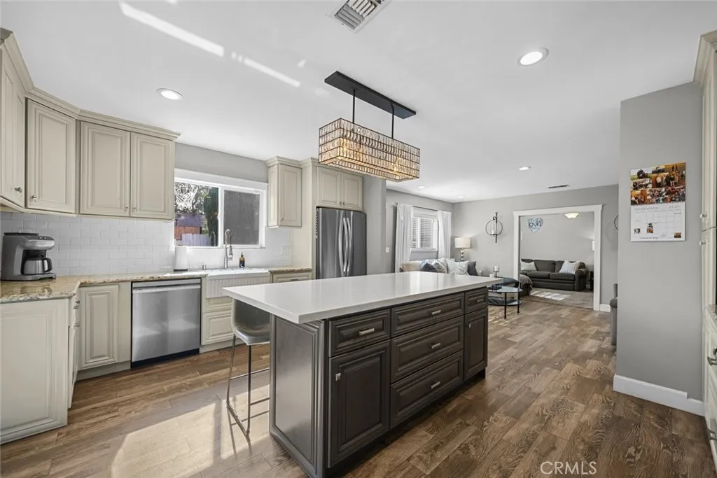 Once inside, you’ll discover an open and airy floor plan filled with natural light. The spacious living area showcases recessed lighting, ceiling fans, and rich wood flooring that flows throughout. The kitchen is equipped with stainless steel appliances, ample cabinetry, and a kitchen island—ideal for gatherings and everyday meals.