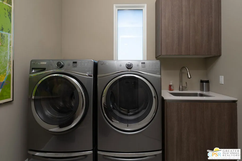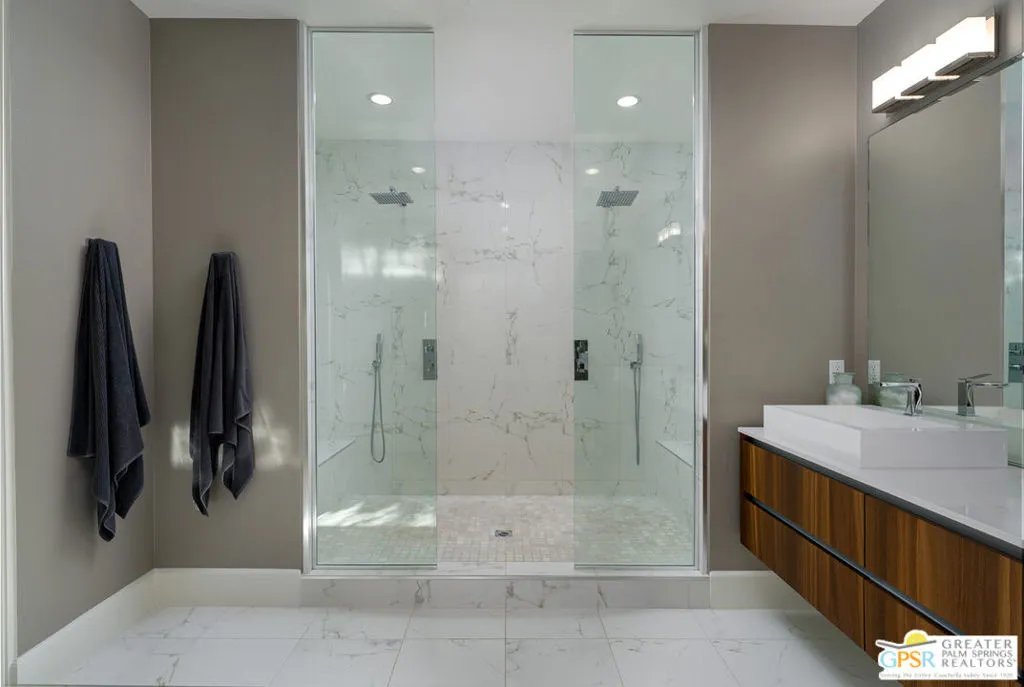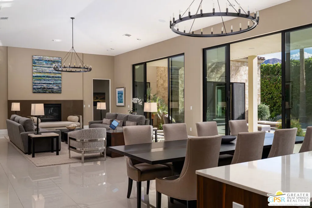Located in the guard-gated community of Monte Sereno, this 3,510 sq ft modern villa offers refined contemporary living on fee land in South Palm Springs. Sited on a premium south-facing lot, the home enjoys unobstructed western views of Mount San Jacinto from the pool and primary suite. Offered furnished, the interiors feature a neutral, cohesive palette and thoughtfully curated finishes throughout. The open great room is defined by soaring ceilings and walls of glass that create seamless indoor-outdoor flow. A sleek chef’s kitchen anchors the space with two islands, premium cabinetry, high-end appliances, and designer lighting, an entertainer’s dream. The primary suite opens directly to the pool and lawn through oversized sliders and includes a large walk-through closet and a spa-style bath with dual walk-in shower and freestanding soaking tub. Two additional ensuite bedrooms provide excellent separation and comfort for guests. Outdoor living is highlighted by an architectural pool, covered pavilion with fireplace, outdoor shower, and raised garden areas. Landscape design by Studio Desertscape incorporates native plantings, boulders, and layered textures to create privacy and a true resort-style setting. Additional features include owned solar, a tandem four-car air-conditioned garage, and oversized laundry and pantry storage. A well-executed combination of architectural pedigree, elevated interiors, and a prime South Palm Springs location at an incredible value.