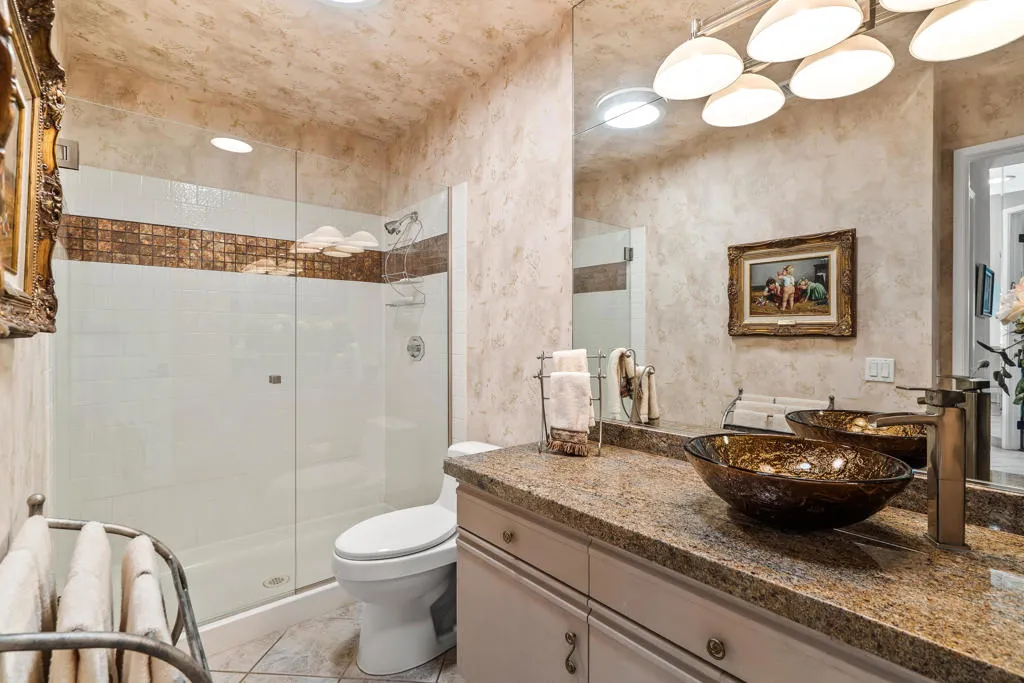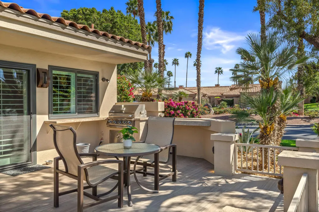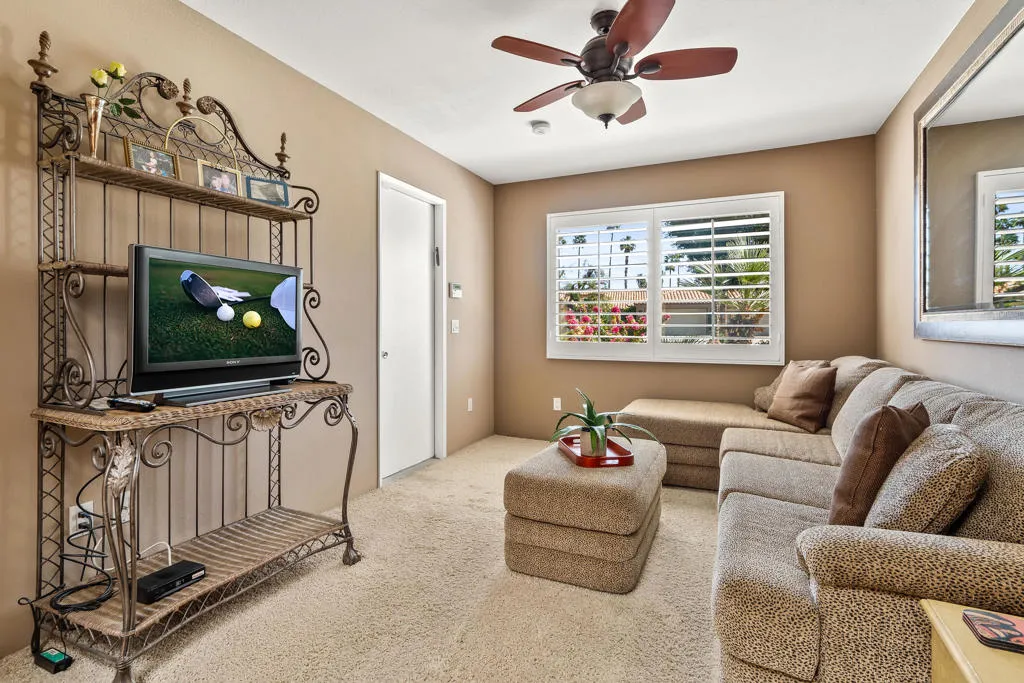 This expanded Sycamore home captures the essence of desert living — spacious and surrounded by breathtaking golf and mountain views. Set along the 7th hole of the Challenge Course, this home enjoys a front-row seat to fairways, shimmering waterways, and dramatic western sunsets. The generous primary suite spans approximately 700 square feet, including a 300-square-foot addition that creates a private retreat with an office and separate den divided by pocket doors. The primary bath was completely redesigned with new cabinetry, counters, wood flooring, and a refreshed shower and tub. The kitchen opens to the outdoors and features stainless steel appliances, granite slab counters, and direct access to the expanded rear patio — perfect for entertaining. The outdoor living space includes a built-in BBQ, porcelain-tiled flooring, custom lighting, and a remote-controlled awning, all oriented to capture the magnificent mountain backdrop. The living room frames the view through large windows by day and is warmed by a corner fireplace by night. Two guest rooms offer flexibility — one currently used as a den with privacy doors, and another with its own en-suite bath. With championship golf, pickleball, tennis, and swimming just steps away, Palm Valley Country Club welcomes you. Short-term rentals permitted!