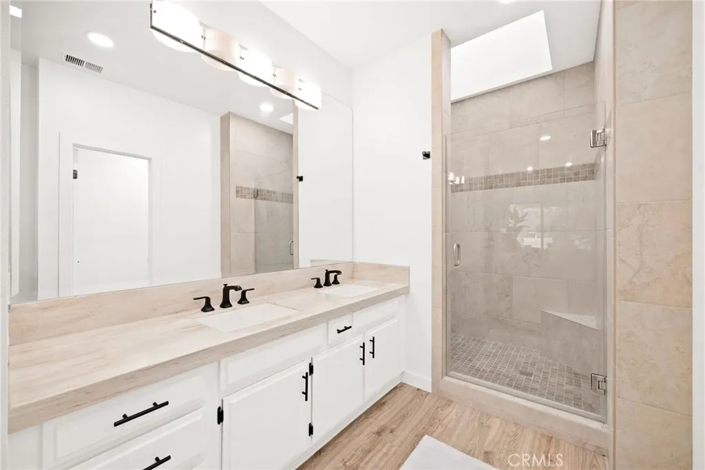 The main primary suite serves as a true retreat, featuring a beautifully remodeled bathroom with a soaking tub, dual vanity, walk-in shower with an overhead skylight that fills the space with natural light. A private walk-out patio extends the suite outdoors, creating a peaceful setting to relax and unwind.