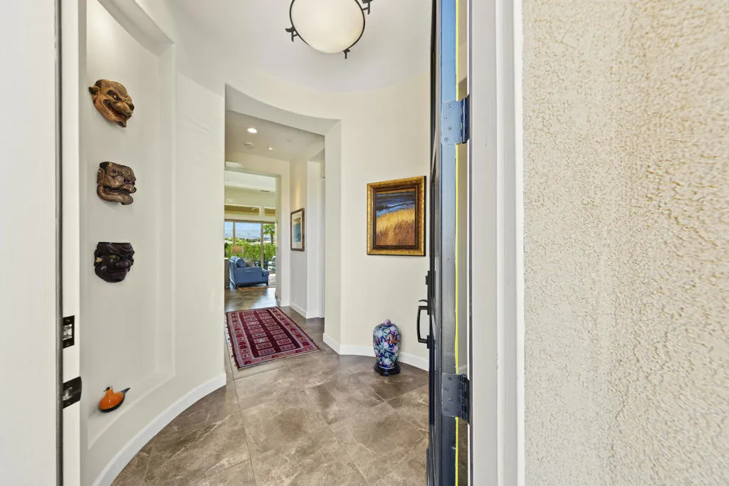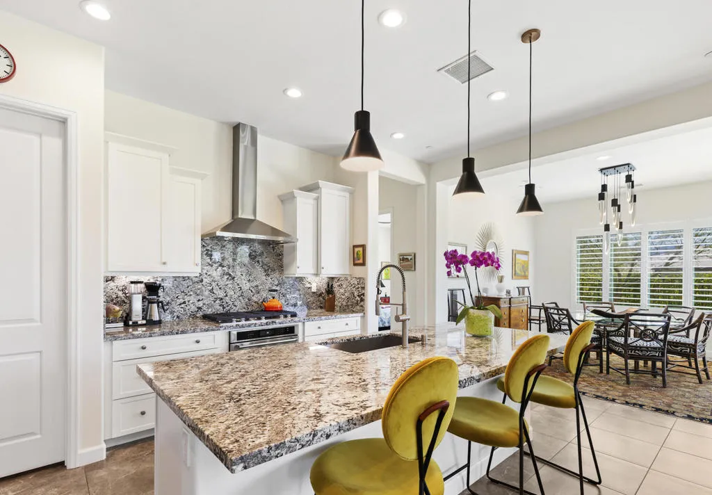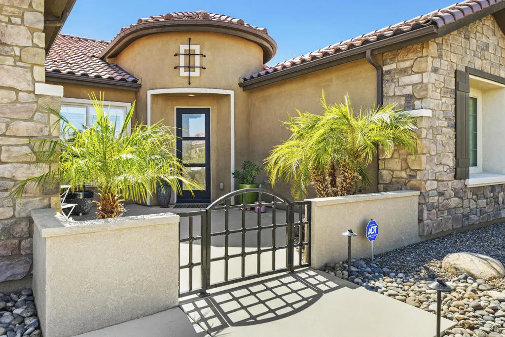 Desert Resort Living! Welcome to this stunning SERENITY model with OWNED SOLAR and situated on an elevated corner lot to capture panoramic MOUNTAIN VIEWS. Featuring high ceilings and walls of glass, the home exudes luxury the minute you step into the rotunda foyer from the courtyard. The open floor plan centers on a sleek kitchen with KitchenAid appliances, granite countertops and an expansive island that flows into the living area with a MULTI PANEL SLIDING DOOR SYSTEM opening to a resort style backyard for true indoor/outdoor living. Enjoy the sparkling PebbleTec pool and spa plus side patio with pergola for BBQ and al fresco dining. Two private ensuites are well separated for privacy and the luxurious primary suite with spa like bath and custom walk-in closet opens to the pool and fabulous mountain views. The office/den with french doors and custom built-ins can also be used for a third sleeping space. Conveniences include a wine fridge, laundry room with sink and the garage features a built-in workshop, lots of storage, a water softener, tankless water heater plus its own A/C unit and insulated garage walls/ceiling. With all the finest finishes and details, this home has been meticulously maintained and is ready for you to enjoy. Del Webb Rancho Mirage is the premier 55+ community with walking trails, incredible views and so convenient to upscale shopping and dining. Residents enjoy a low HOA fee that includes cable and internet, Clubhouse, pools, tennis courts, pickelball, putting green, fitness center and endless activities. Call today to schedule your private showing and see the best view at Del Webb.