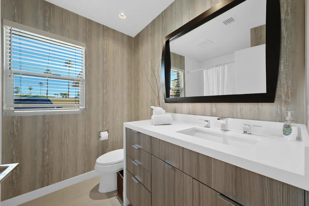 Famed architect Harold Levitt left LA to design these 5 one of a kind homes. From the cross beams under the giant skylight to perfectly placed windows and sliders to maximize the view and light, this is an incredible space that needs to be seen in person . Full furnished ; Situated on the fifth and sixth fairways of The Shadow Mountain Golf Course and just up the road from El Paseo with all the shops and restaurants , where could you find a better location. This home has been totally renovated from a heated bathroom floor to all dual pane windows and sliders, custom cabinetry , porcelain tile floors and more. The primary has an office nook and walk in closet with skylight and built-ins. Kitchen has quartz counters with Bosch gas range and dishwasher and breakfast bar. THE DEN has large closet for extra guests and currently used as TV room. This out of town owner hates to give this upbut biz elsewhere requires him to sell. Don’t miss out on this one. It qualifies as a PUD so even a reverse mtg is possible.