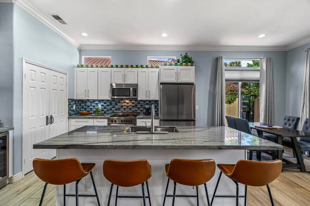 REMODELED, Move-in ready and close to the clubhouse! This 3 bedroom, 2 bath home has an open design floorplan and NEW custom redesigned/remodeled kitchen with new cabinetry, quartzite slab counters, decorative tile backsplash, stainless steel appliances and built-in wine fridge. The primary bedroom also has a remodeled custom tiled shower with dual vanities, large walk-in closet and double French doors to your private yard with covered patio. Additional upgrades include a courtyard entry, dramatic leaded glass entry door, LED recessed lighting, crown molding, vinyl flooring with tall baseboards, rain glass bathroom windows and new hardware throughout. Heritage Palms is a premier adult community featuring an 18 hole championship golf course, pickleball & tennis courts, indoor & outdoor pools, fitness center, grill room, card rooms, billiards room, social clubs and more.