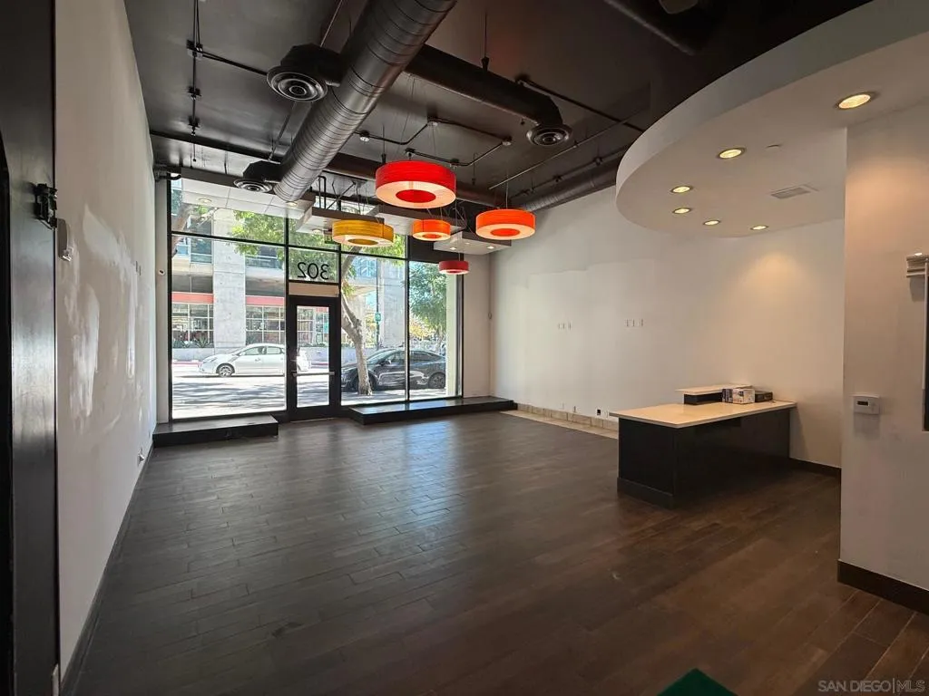RETAIL STOREFRONT in the popular Icon Condominium Bldg. This vacant retail store front commercial condominium is located in the Petco Park area of East Village. Steps to Petco Park, home of the San Diego Padres with restaurants, coffee shops, microbrewery pubs and many residential condos and apartments in the neighborhood, this retail store front condo offers several business use opportunities, from a professional business, law firm, insurance company, dry cleaner pick-up and many other business uses. This could have tenant set up with base rent with NNN’s to have tenant pick up many of the expenses related to the commercial condo. Space includes floor-to-ceiling glass storefront, decorative drop lighting and can lights. Space has a built-in private bathroom, small office, storage room and additional upstairs storage.