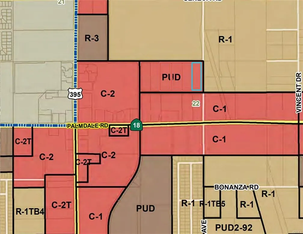 2.38 Commercial C-1 / PUD parcel adjacent to the Super Walmart center at Hwy 395 and Palmdale Rd. Great location adjacent to one of the most busy High Desert Intersections, adjacent to a major shopping corner anchored by Super Walmart, and centrally located to future Housing expansion areas. Property has a PUD ordinance which states development must follow guidelines for the C-1 zoning designation. Intent of the PUD is to ensure the combined development of all six parcels located East of Cantina, West of Mesa Linda and South of Begonia. Individual development is allowed under the PUD if done in a manner that ties to a neighboring parcel in at least several ways, including: circulation and access, building and signage design and drainage. For a copy of the PUD, please email Listing Agent. 55 ac directly North currently being mapped out for residential subdivision.