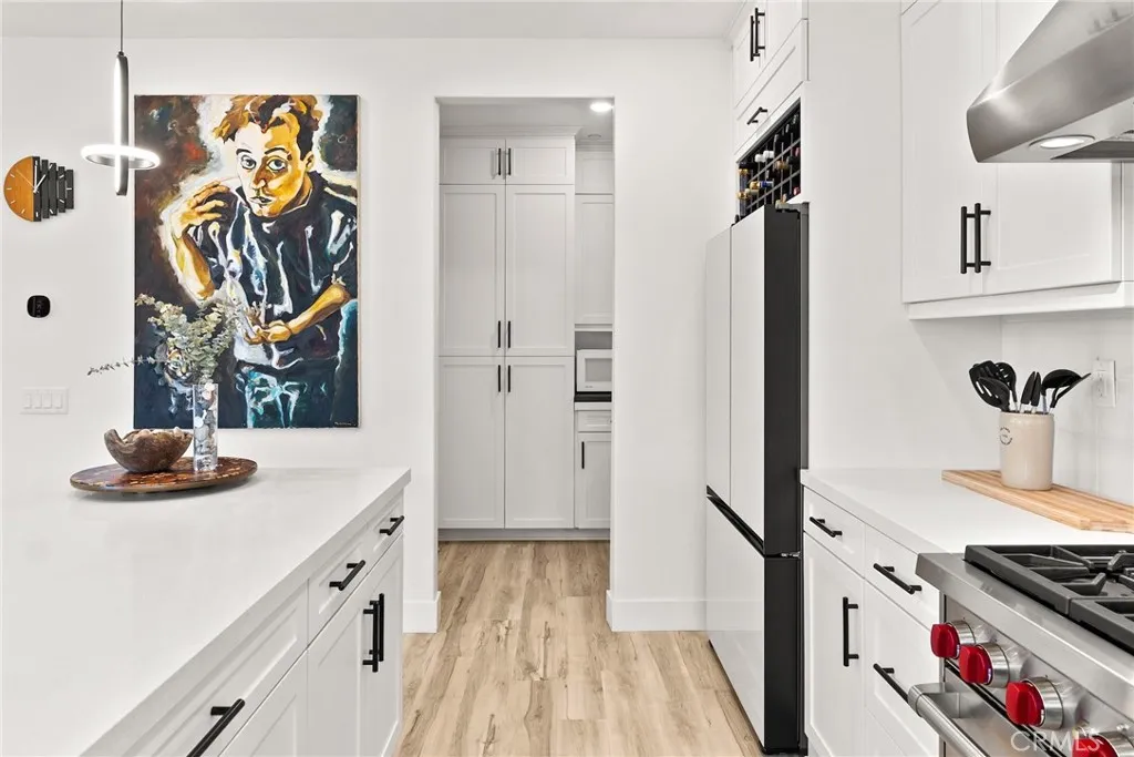 A Wolf 36″ six-burner gas range, professional Wolf hood, and Cove luxury dishwasher anchor a high-performance kitchen, complemented by a French-door refrigerator. White Shaker cabinets extend floor-to-ceiling with quartz counters and full-height tile backsplash, while upgraded storage includes pull-out spice racks and deep drawers for cookware. The walk-through butler’s pantry adds prep space and a wine-ready niche. Custom black-framed doors from The Sliding Door Company define the transitions between entry, dining, and living spaces, coordinating with matte-black hardware and fixtures found throughout. Wide-plank luxury vinyl flooring spans the entire home, including all five bedrooms and the staircase.