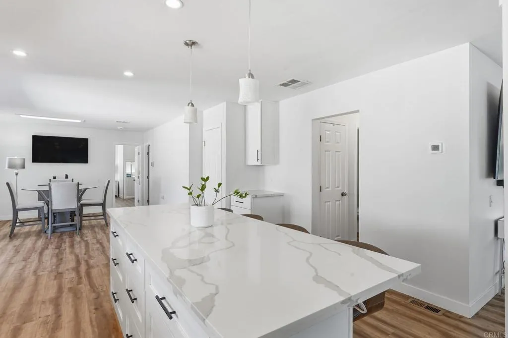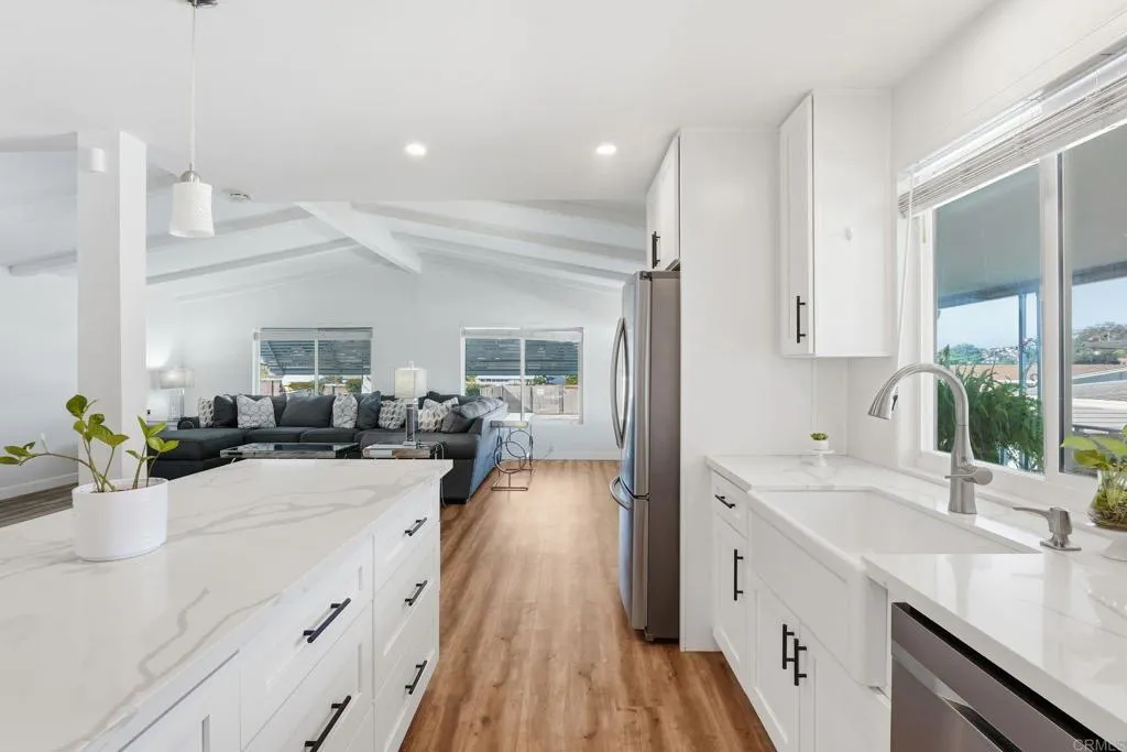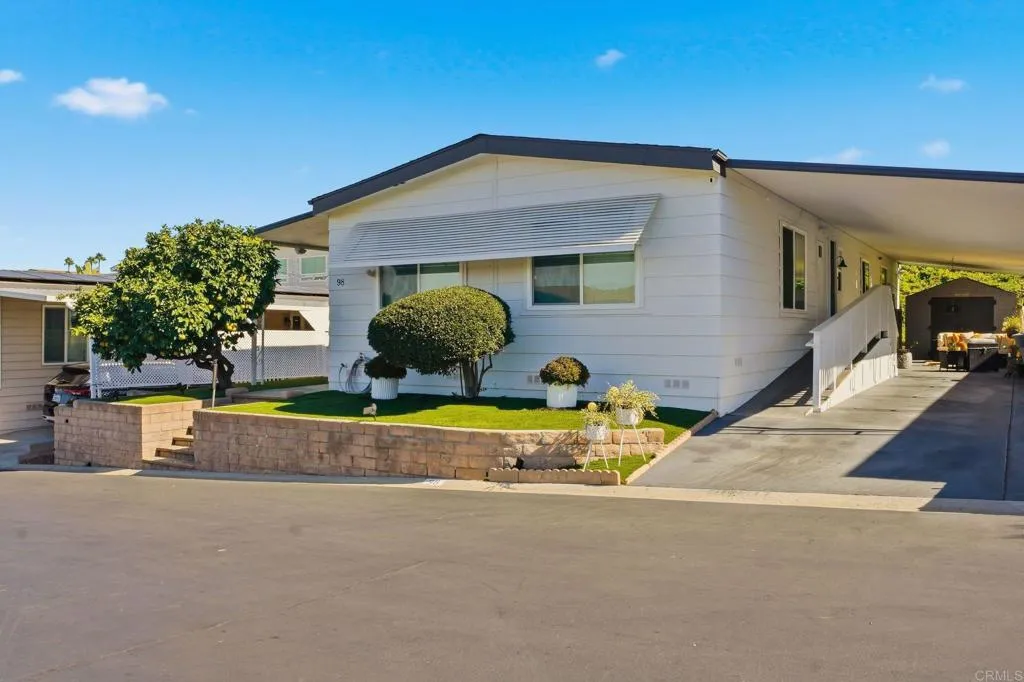 Exquisite and move-in ready! YOU OWN THE LAND ~ NO SPACE RENT~ Located in a desirable 55+ community, this beautifully updated 3-bedroom, 2-bath home showcases modern comfort and thoughtful design. The open layout features laminate flooring throughout, recessed lighting, and a bright skylight. The stunning kitchen boasts an oversized island with bar seating, quartz countertops, soft-close cabinets, farm-style sink, stainless steel appliances, and a new water heater. The primary suite offers dual sinks and a walk-in closet. Additional highlights include ~NEW A/C ~ 6-year-old roof, washer and dryer in the home, artificial turf landscaping, and a storage shed. The park also provides extra storage for your toys and vehicles, plus amenities such as a clubhouse, pool, guest parking, and laundry facilities. A perfect blend of elegance, functionality, and low-maintenance living!
