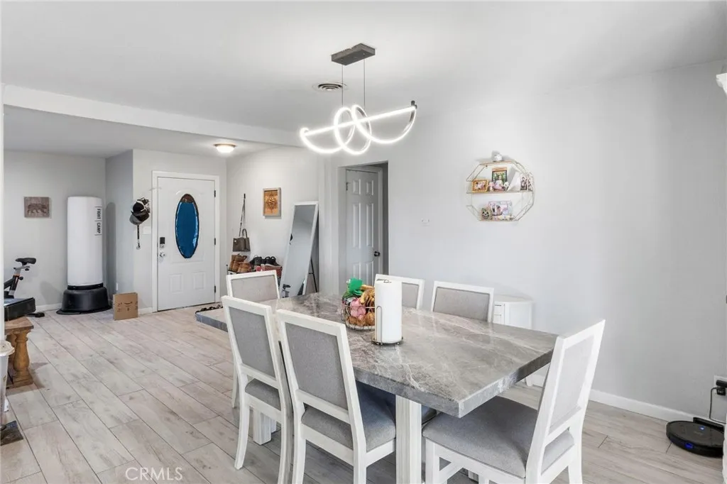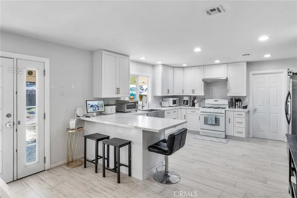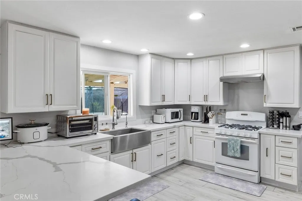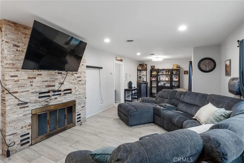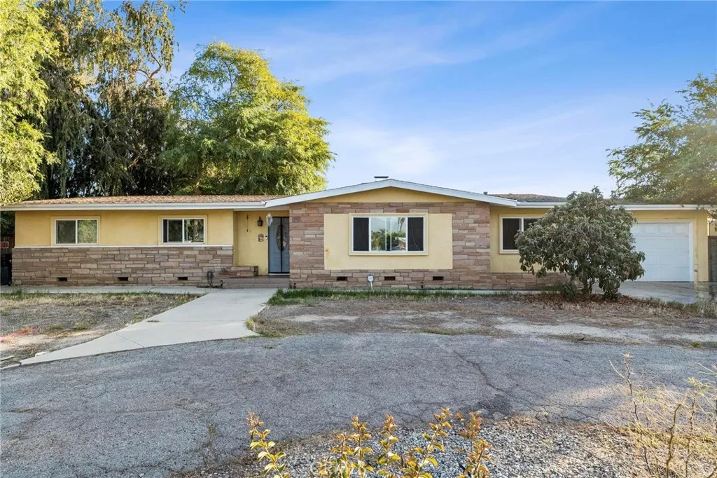 Welcome to this stunning 3-bedroom, 2-bath home offering a comfortable living space on an expansive lot. Step inside to discover elegant light gray wood-look tile flooring that extends through most of the home, creating a cohesive and modern feel. The spacious kitchen features recessed lighting, crisp white cabinetry, sleek white counter tops, and a large single-bowl sink—perfect for everyday living and entertaining. Enjoy meals under a stylish modern light fixture in the dining area, while both bathrooms showcase beautiful tile flooring and matching tile back splash in the showers, complemented by energy-efficient LED lighting. The primary bedroom offers a private en suite bathroom for added comfort, while the guest bedrooms feature cozy carpet flooring and ceiling fans. Additional highlights include recessed lighting throughout the home, a generous laundry room, and a large covered patio overlooking the spacious backyard—ideal for outdoor gatherings. The backyard also includes small sheds and an enclosure, offering extra storage and versatility.The property features a two-car driveway, an attached two-car garage, and a convenient roundabout for easy access. The front exterior is accented with attractive brick and stone detailing, adding timeless curb appeal. With plenty of space and potential both inside and out, this home is ready to welcome its new owners.