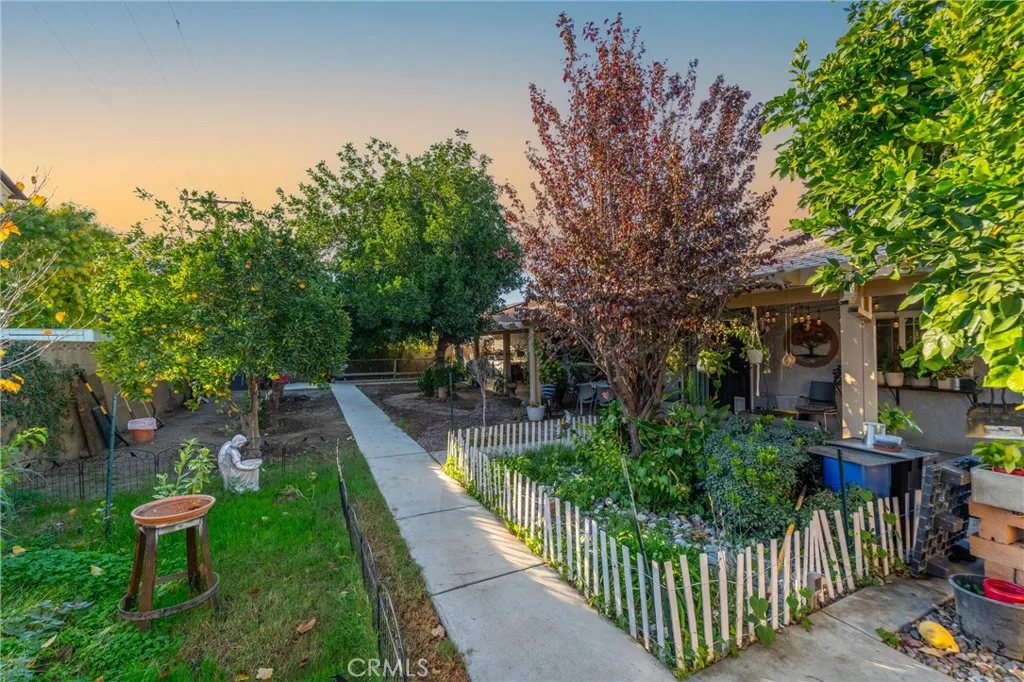 Welcome home to this beautifully maintained single-story, 3-bedroom, 2-bath ranch-style residence, located in a serene neighborhood. Inside, the light-filled country kitchen features granite countertops, plenty of cabinets, stainless steel appliances, a breakfast bar, recessed lighting and updated finishes. The spacious living room offers hardwood flooring, a striking brick fireplace, custom shutters, and a ceiling fan perfect for both relaxing and entertaining. The frontside exterior has a showcasing circular driveway, gated entry for recreational vehicles, desert toys, or potential RV parking, and an attached two-car garage. A cozy sitting area behind a wrought-iron gate creates a private retreat, surrounded by citrus trees a large back yard and highlighted by a great size Aluma wood patio cover excellent for family gatherings, barbecues and guests entertaining. This home features no HOA, low property taxes, and a prime location close to schools, parks, and shopping.