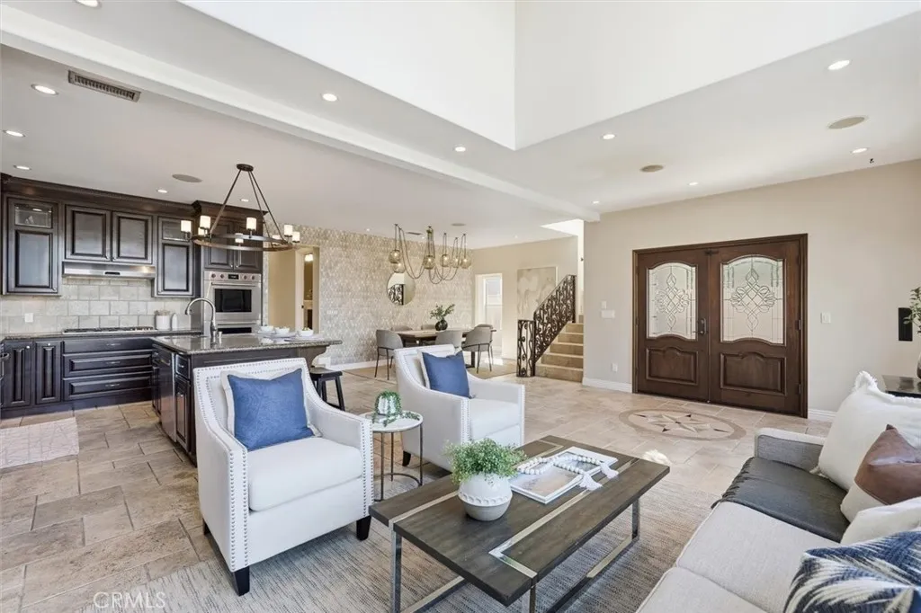 The highly upgraded chef’s kitchen is equipped with premium stainless-steel appliances including Wolf range and hood, Wolf double ovens, and a Sub-Zero refrigerator, centered around a functional island ideal for cooking and entertaining. The spacious Great Room flows seamlessly to an outdoor patio, creating the perfect indoor-outdoor living environment.