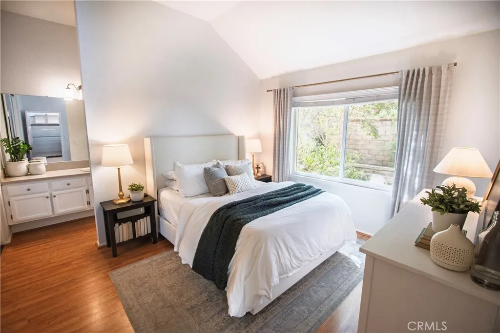 Located on a quiet cul-de-sac in The Bungalows, this updated Valencia home offers warmth, charm, and an exceptionally functional layout. With two bedrooms downstairs and a spacious loft upstairs that has been converted into a third bedroom, the home provides a surprising amount of flexibility for guests, work, or additional living space. Natural light fills the living room, where vaulted ceilings create an airy feel and a cozy fireplace anchors the space. The dining area sits just off the beautifully refreshed kitchen, which features stylish finishes, a barn door, and a layout that makes both everyday cooking and entertaining feel effortless. The primary bedroom includes its own en-suite bathroom, while the second downstairs bedroom also enjoys a private bath—ideal for comfort and privacy. Throughout the home, thoughtful upgrades add to the sense of ease and move-in readiness.