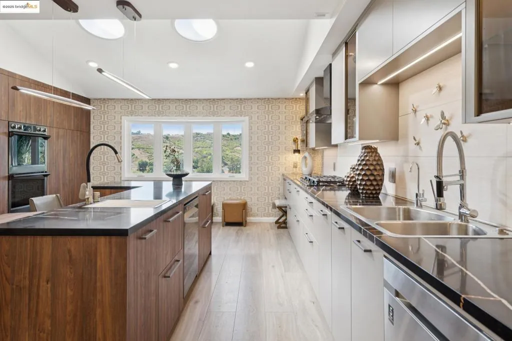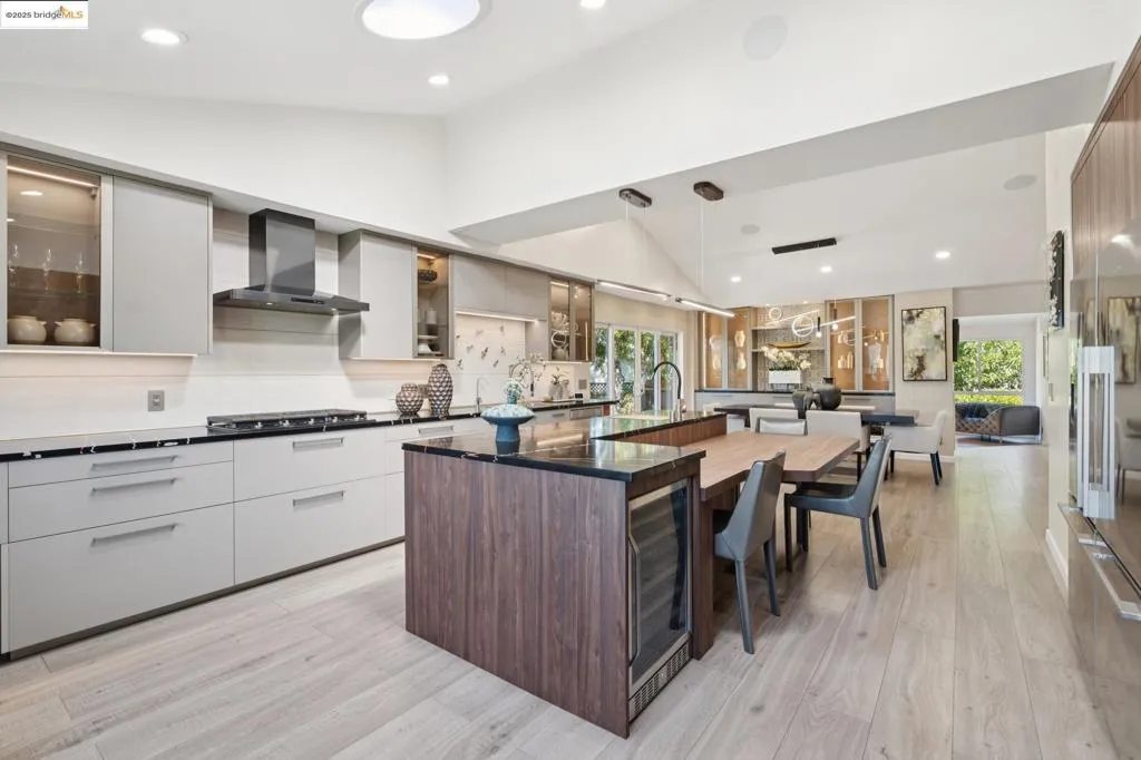 Designer masterpiece—down-to-studs reinvention in Moraga’s coveted Campolindo. Minutes to top-rated schools, shops, trails, Hwy 24 & BART. Flexible two-level layout that can live together or independently: each level has its own entrance and primary suite; the upper level showcases a magazine-worthy chef’s kitchen, the lower level adds a kitchenette and a generous family/game room. Quality shines throughout: all-new systems, radiant heated floors on the lower level, Simonton energy-efficient windows/doors, recessed lighting, European-style interior doors, luxury accent wallcoverings, and gorgeous water-resistant flooring. The statement kitchen pairs Italian Cucine Lube cabinetry, quartz, BLUM hardware, Fisher & Paykel fridges, Samsung double oven/cooktop & twin dishwashers, wine fridge, sun tunnels, and a 10’ Milgard slider to a view deck. Outdoor living is resort-caliber: multiple view decks, new hardscape & paver patios, perimeter drainage, and three rain-water collection tanks for eco-irrigation. Enjoy a roof-covered outdoor kitchen and a detached cedar sauna retreat with bathroom and lounge. Set on a huge lot with mature landscaping and an orchard’s worth of fruit trees. A rare turnkey compound with multi-gen and ADU-style flexibility—crafted for effortlessly luxurious living