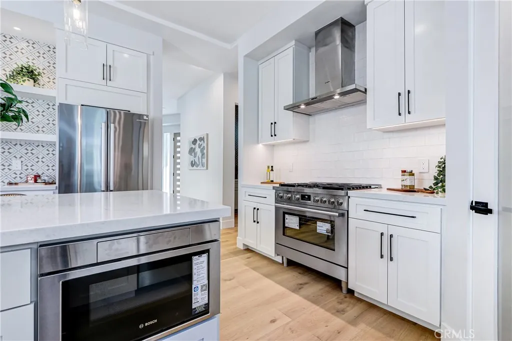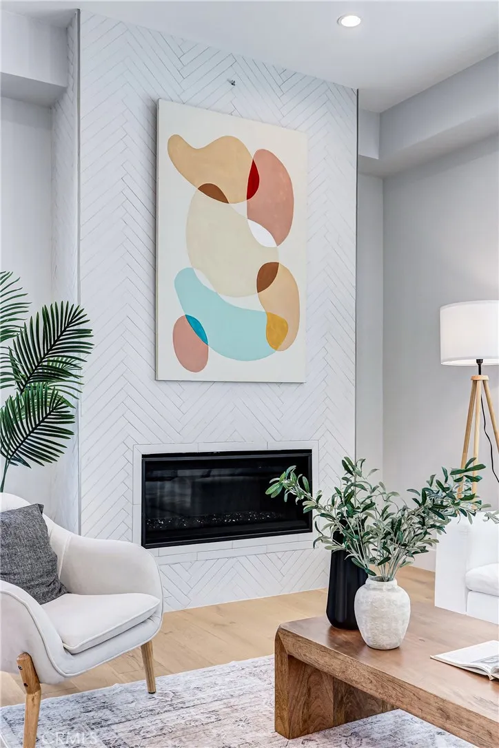 The main level is devoted to everyday gathering, with the kitchen, dining, and living areas arranged to flow seamlessly to the home’s exclusive, real-grass backyard. The kitchen performs at the level of a $3M SFR, featuring premium Bosch appliances, a walk-in pantry, a dry bar, a large island, and abundant storage. The living room centers on a modern fireplace and opens directly to the outdoor space, creating an easy indoor–outdoor rhythm ideal for hosting.