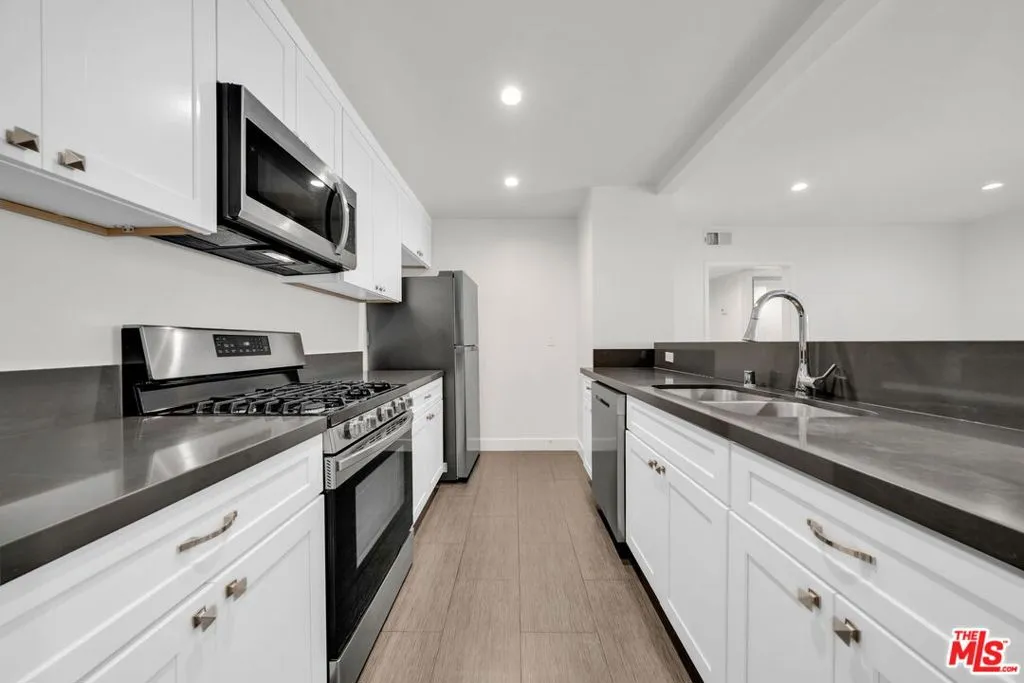 TOP FLOOR light & bright remodeled large one bedroom apartment in the heart of Lake Balboa. Open remodeled kitchen with lots of counter space and brand new appliances. There is also a spacious patio off the living room. Laminate wood floors throughout. Other features include central A/C, recessed lighting and one assigned parking spot in a gated garage. Smaller 10 unit building building with digital video controlled access. PET FRIENDLY.