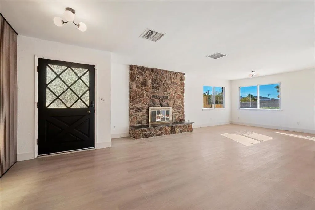 Discover this exceptionally charming home tucked away in the highly desirable Western Hills Ranchos neighborhood. Located on a peaceful cul-de-sac, this spacious property offers a welcoming blend of character, comfort, and potential both inside and out.Step into a massive living room featuring a beautiful wooden accent wall, lovely new flooring, and a cozy fireplace that sets the tone for the home’s inviting feel. The layout includes a separate dining room and a fully remodeled kitchen showcasing an apron sink, quartz countertops, shaker cabinets, and updated finishes throughout. This bright and stylish kitchen connects directly to the home’s standout feature: an expansive sunroom.Filled with natural light from multiple skylights and open windows, the sunroom offers surrounding views of the lush backyard and provides access to the kitchen, outdoors, and primary bedroom. It also has the potential to be converted into additional living space or extra rooms if desired.The primary suite includes a walk-in closet, a jetted Jacuzzi tub, dual sinks, a built-in vanity, and private access to the sunroom. Both bathrooms are generously sized, complementing the home’s comfortable, family-friendly layout.Outdoors, you’ll find one of the most unique and beloved features of the property: a beautifully maintained garden oasis with mature trees, grapevines, and real grass. This rare, lush setting creates the feeling of not even being in the desert. Multiple gated entry points, a built-in outdoor barbecue area, patio seating, and charming landscaping make the backyard perfect for entertaining or relaxing in total privacy.The home also features newer HVAC, sewer connection, two large driveways that both provide access to the house (one with a full wraparound), an outdoor shed for additional storage, and an oversized garage with plentiful space that could also be converted into additional bedrooms. It was previously used as an art studio.With its warm, homey feel, spacious layout, and highly usable yard, this property is ideal as a family home, a desert retreat, or a strong investment opportunity. A must-see in one of Yucca Valley’s most sought-after neighborhoods.