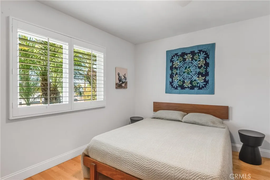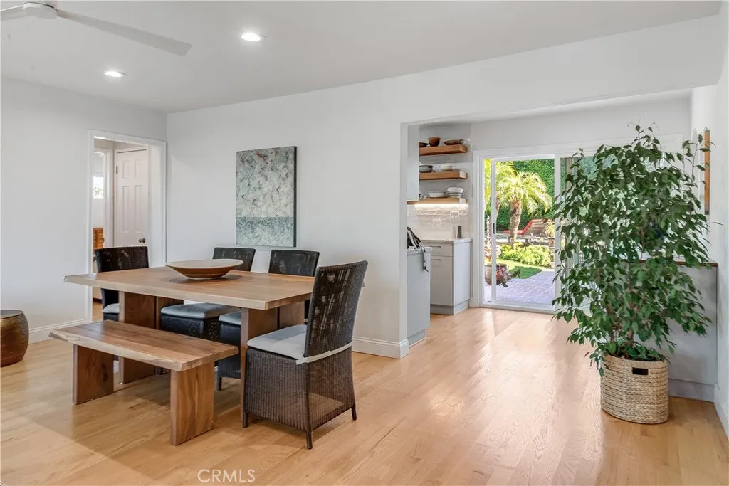 Inside, the home showcases a thoughtfully redesigned interior. The newly-remodeled contemporary kitchen is equipped with Bosch appliances, and includes custom cabinetry with walnut floating shelves and Montblanc quartzite countertops. The open living area is bright and welcoming, with a new sliding patio door that brings the outdoors in, recessed lighting, ceiling fans, a charming front bay window and elegant oak hardwood floors throughout.
