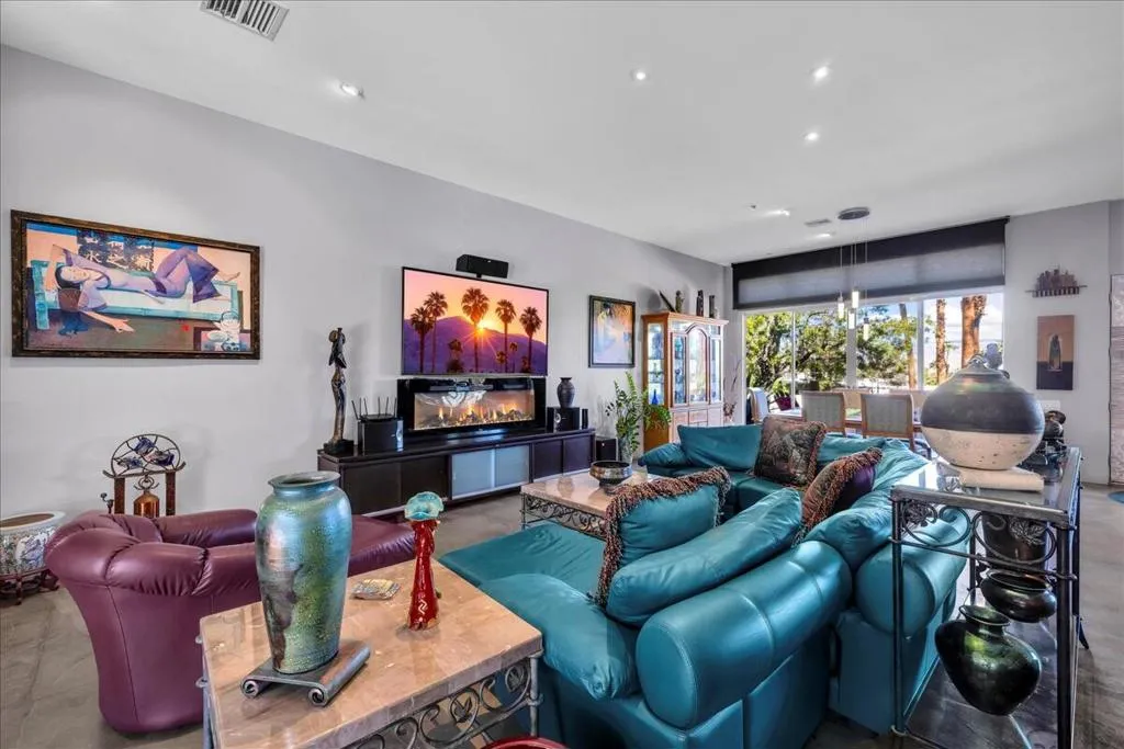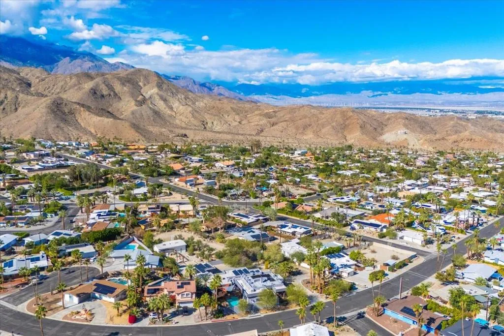 Perched high in Cathedral City Cove, this captivating 4-bedroom, 4-bath home with a pool/spa, upper deck and an additional office space blends comfort, style, and sweeping views of the mountains and sparkling night lights of the valley floor. The beautifully landscaped and expansive front yard sets a warm welcome as the circular driveway leads you up a set of stairs to a dramatic double door front entry. Inside, large picture windows fill the home with natural light, while in the living room, there is a delightful mini bar–perfect for entertaining, and a decorative tile fireplace adding charm and character. All bedrooms feature en suite bathrooms, and the home includes a shared dining space with windows to see the view! The large living room is perfect for entertaining with room for plenty of seating. From the kitchen, there is a quiet dining nook and an outdoor patio area. The primary bedroom is large and has great views and an enclosed patio. There is also a large bathroom with a walk-in shower, a soaking tub, and a walk-in closet. The bathroom offers dual sinks and plenty of counter space and storage! Set on an impressive 24,000 sq ft lot, this property embraces true desert indoor-outdoor living with a sparkling pool, and spa, and generous patios. Approx. 4,102 sq ft of living space and leased solar panels for energy efficiency, and additional solar panels to help heat the pool, this stunning hilltop retreat offers space, style, and remarkable views from every angle. This home also offers an upstairs patio space, ready for you to use your own imagination to bring it to its full potential. There is an inside laundry room and a rare 4-car garage, which offers shelving and plenty of storage off a private driveway. The driveway also offers ample parking opportunities. There are no HOA Fees here, and you own the land! Come see this lovely home today and make it yours for the new year!